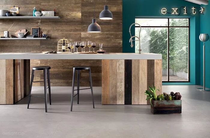将原木组合水泥、金属、大理石等