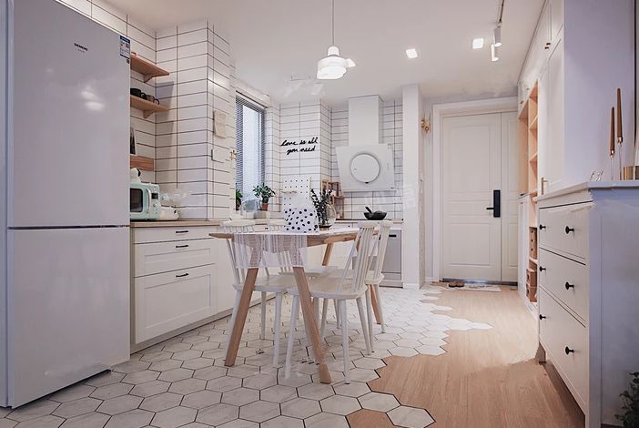 混合铺贴法比较前卫,一般是瓷砖和木地板混合,或者是不同颜色的地砖、瓷砖混合,常用在阳台、玄关、卫生间、厨房等区域。通常色彩和形状具有跳跃性,可以用来分区或增加艺术美感,起到画龙点睛之意。