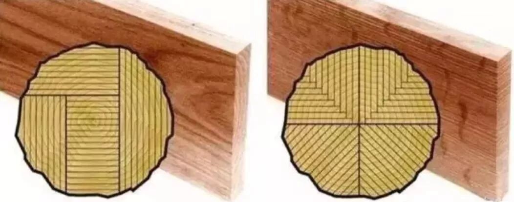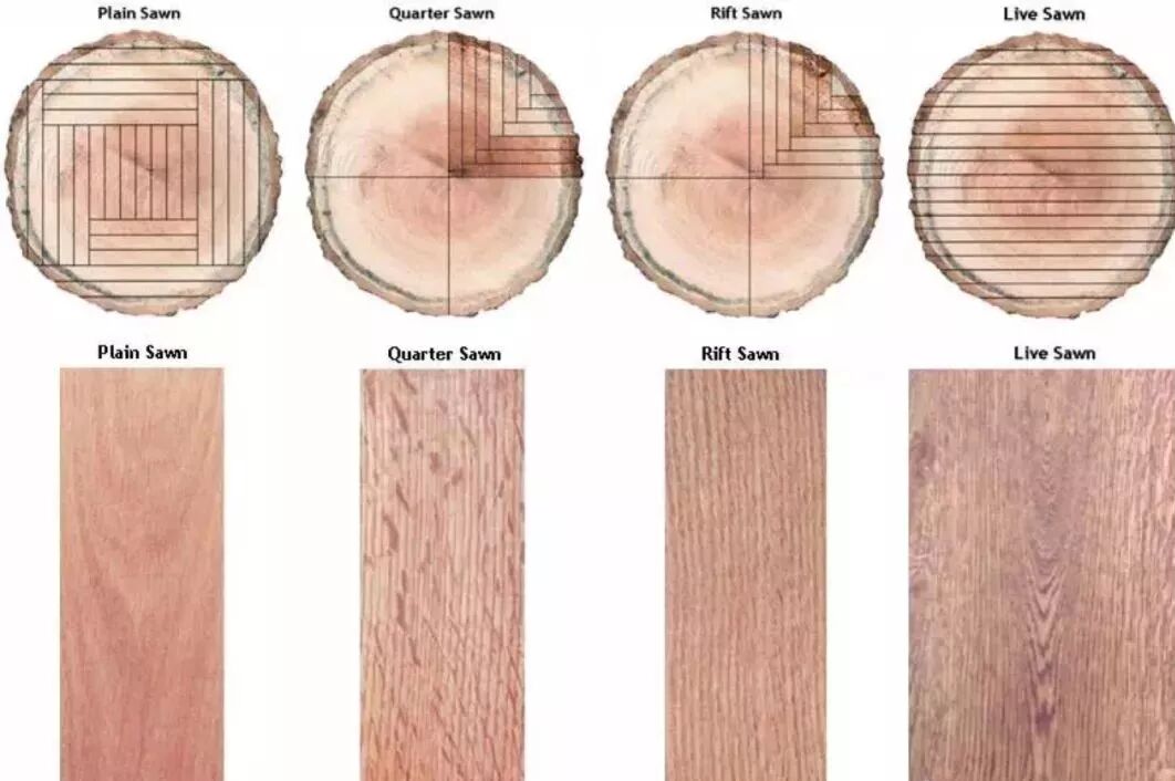 根据切割的方向不同,木材的基本锯法可分为四种:弦切法(Plain/Flat Sawn)、刻切法(Quarter Sawn)、径切法(Rift Sawn)、平切(Live Sawn)。
