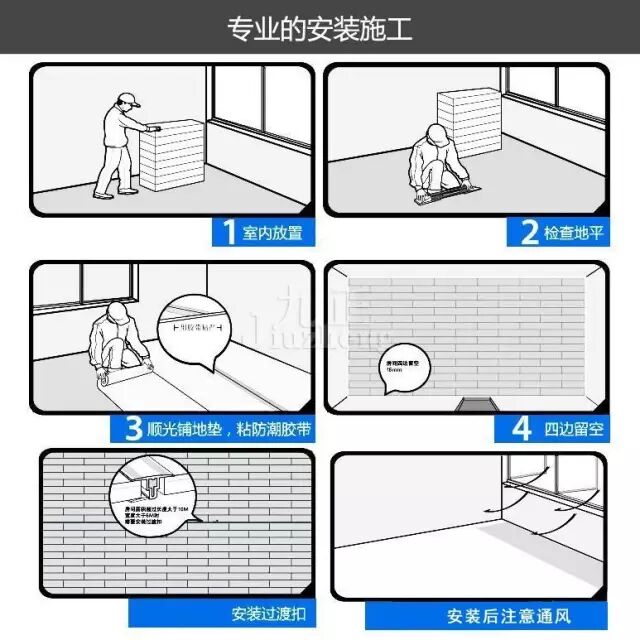 在地板行业内,一直流行着一句话——三分地板,七分安装。也就是说,要想拥有舒适的地板,不仅要求地板本身的品质要好,而且地板的安装过程也非常重要。目前,市场上比较通用的铺装方法是悬浮式铺装。 其工序为:基层处理→找平地面→铺设地垫、地板