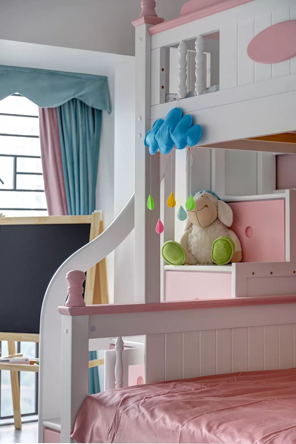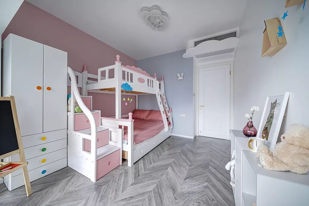 漂浮的云朵形空调挡板、软萌的小兔子壁灯、魔法城堡样式的上下床……在浅灰色与粉色的儿童房里,仿佛置身于梦幻的童话世界中,甜美而浪漫。