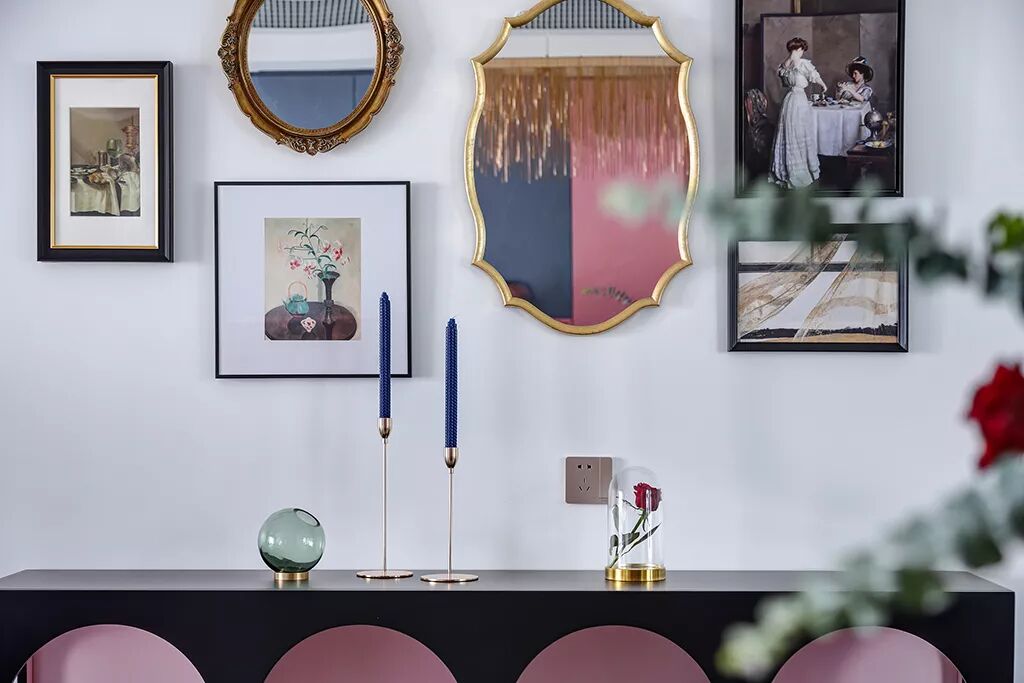 墙面可谓是最好的风景展示区,餐边柜上悬挂六项规格不一的装饰,既有家庭场景的复古油画又有精致典雅的镜子,看似毫无关联,但都极具生活气息。