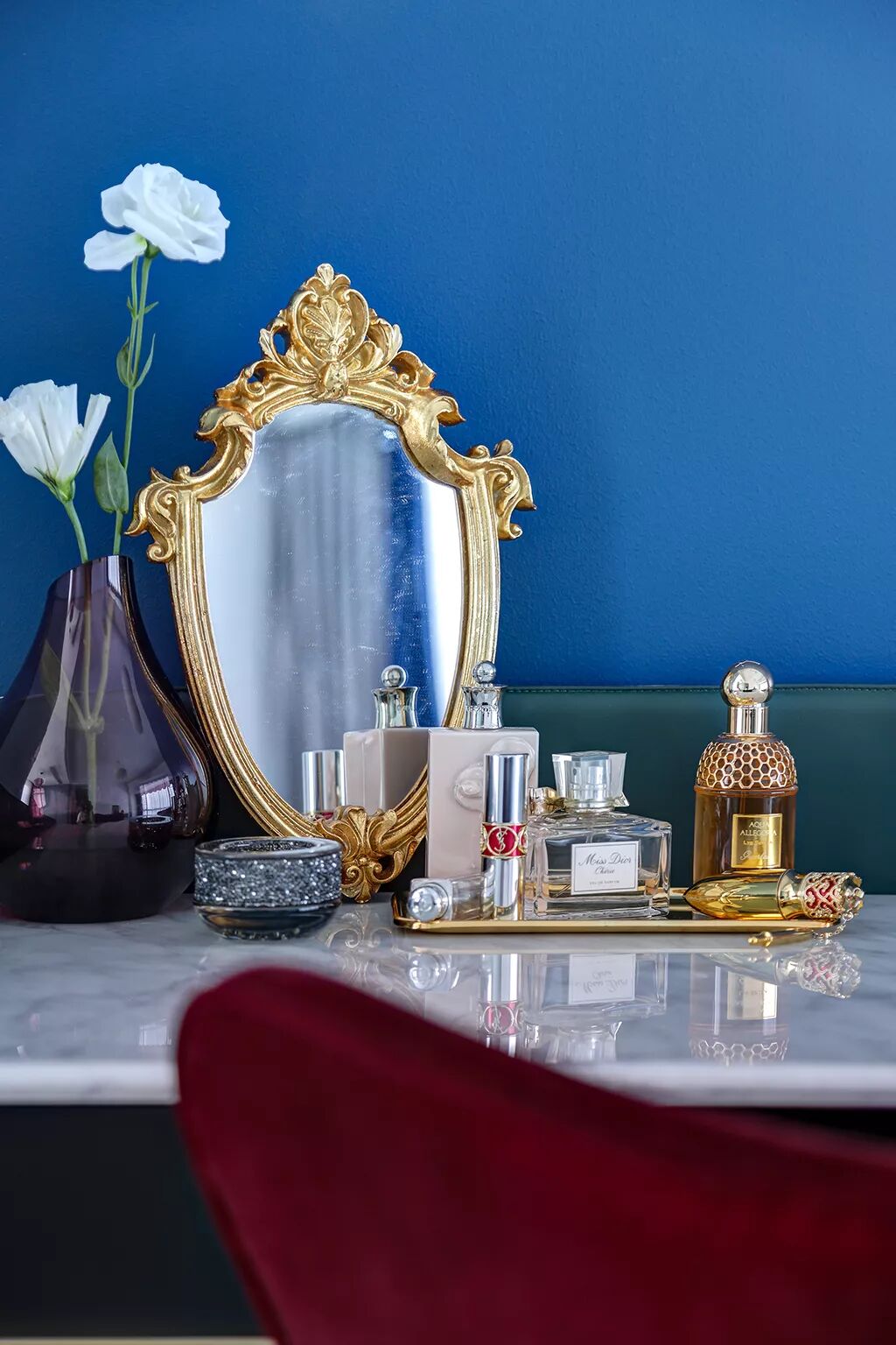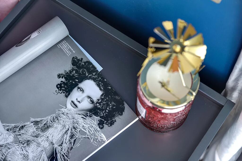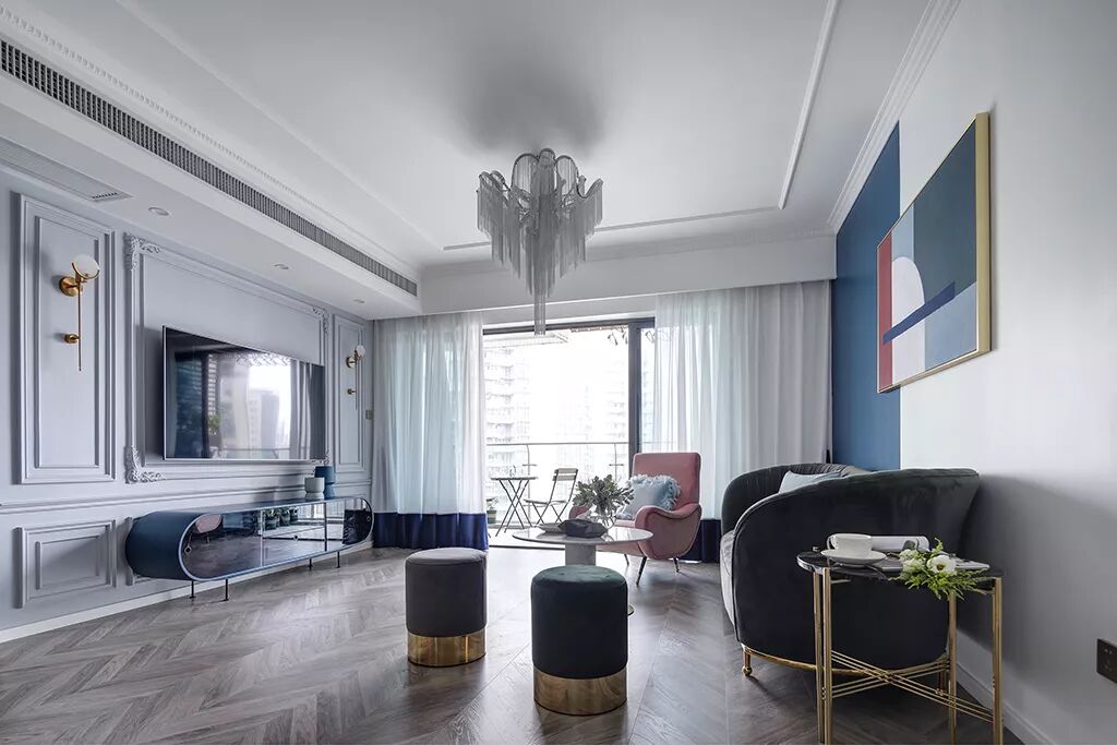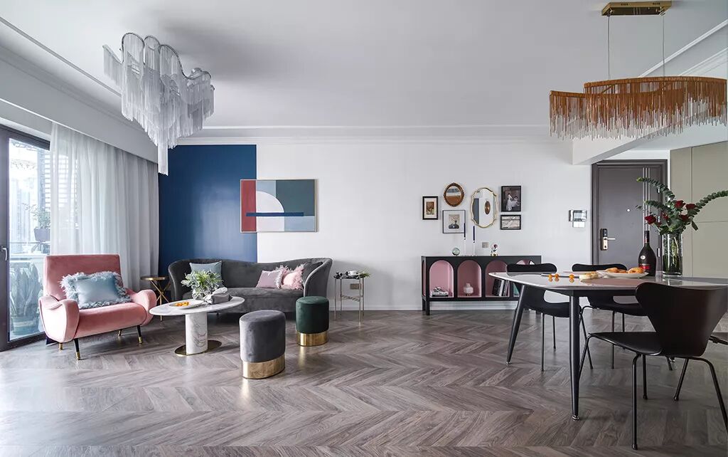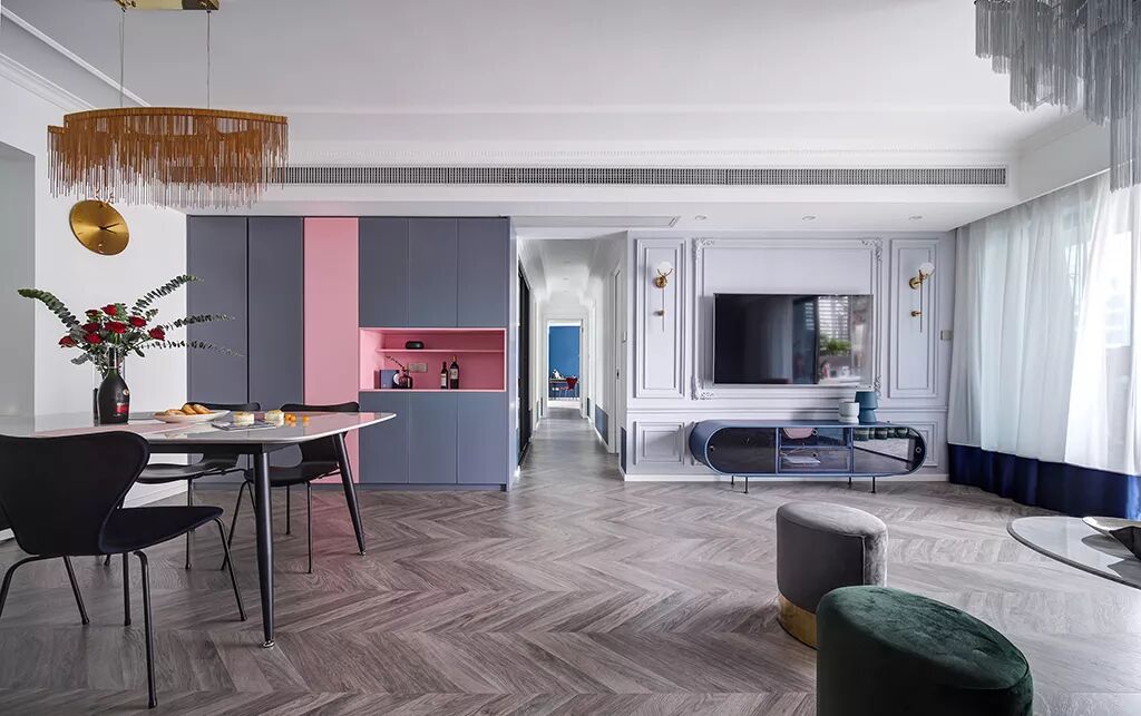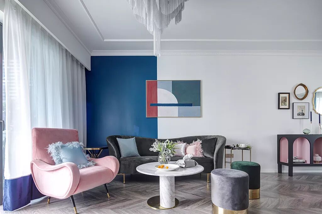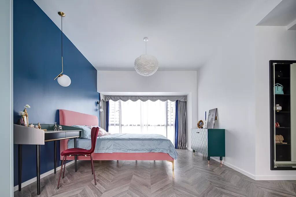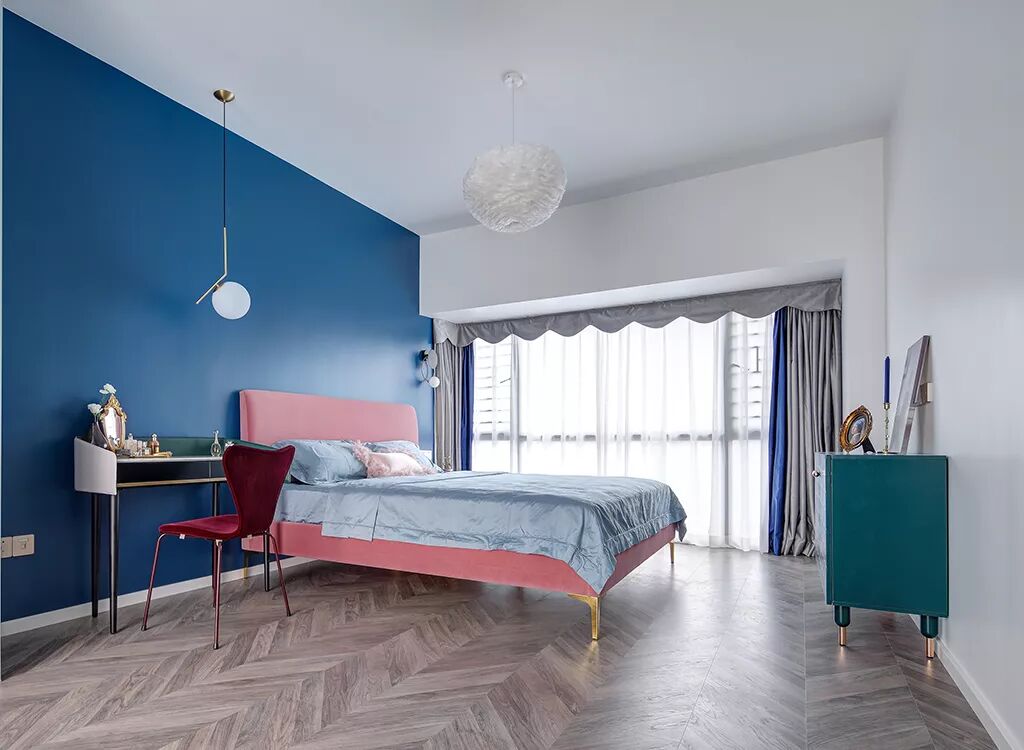 步入主卧,最令人拍案叫绝的是粉与蓝的碰撞!当低饱和度的烟粉色遇上浓烈明亮的蓝色,对比鲜明却又和谐融洽,展现出张扬的浪漫。