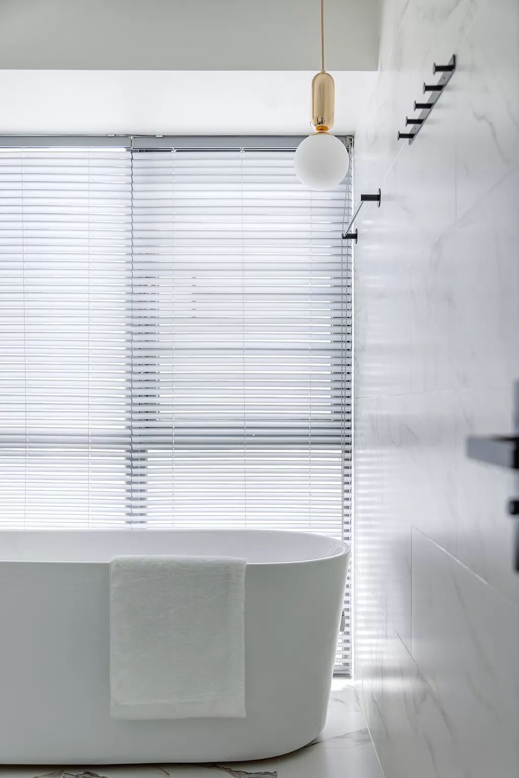 独立式浴缸也让人十分惊喜,简洁的造型,一体式设计,每一个角落都闪烁着精致的光芒。干净利落的曲线元素搭配大理石的天然纹理,精致的灯饰点亮一片柔和,轻奢感油然而生,晕染不朽的浪漫情怀。