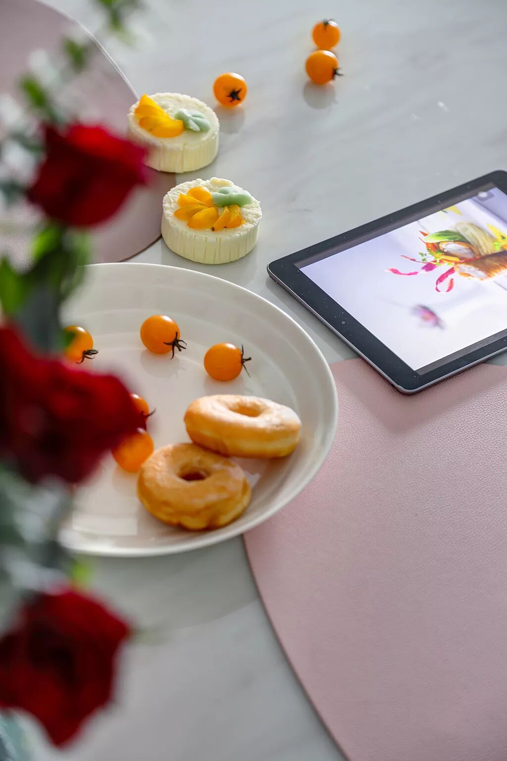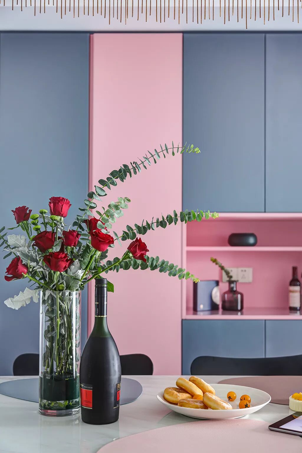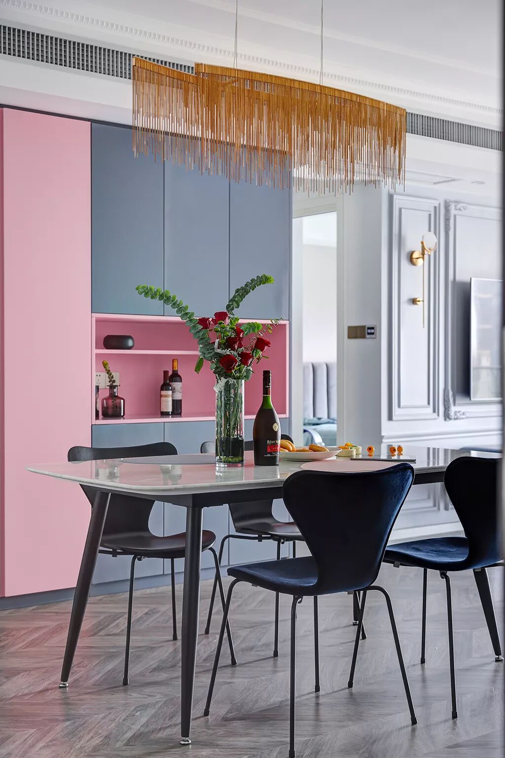 餐厅另一边是到顶的定制柜,粉色与深灰色相间,流畅的线条设计没有任何多余的装饰,十分高级。
