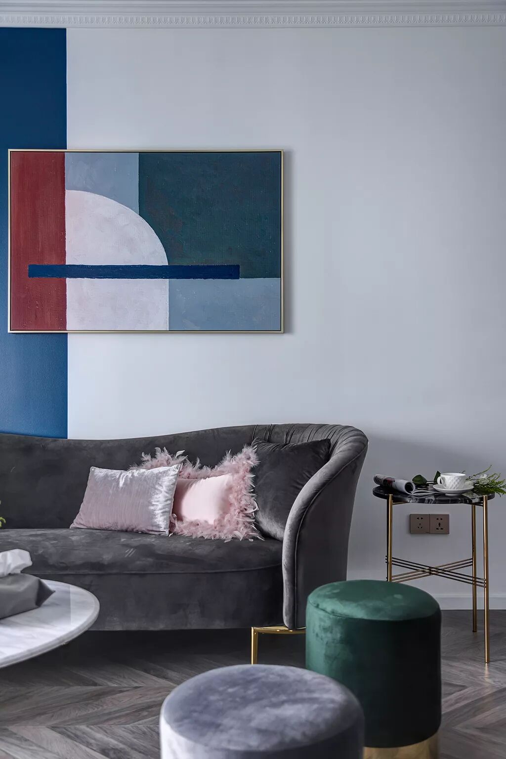 而蓝与白的交界刚好与彩色几何图形挂画分色线重合,以此为界划分的色域区也颇有意思,蓝色、红色、灰色、绿色,恰好是客厅的色系组合!