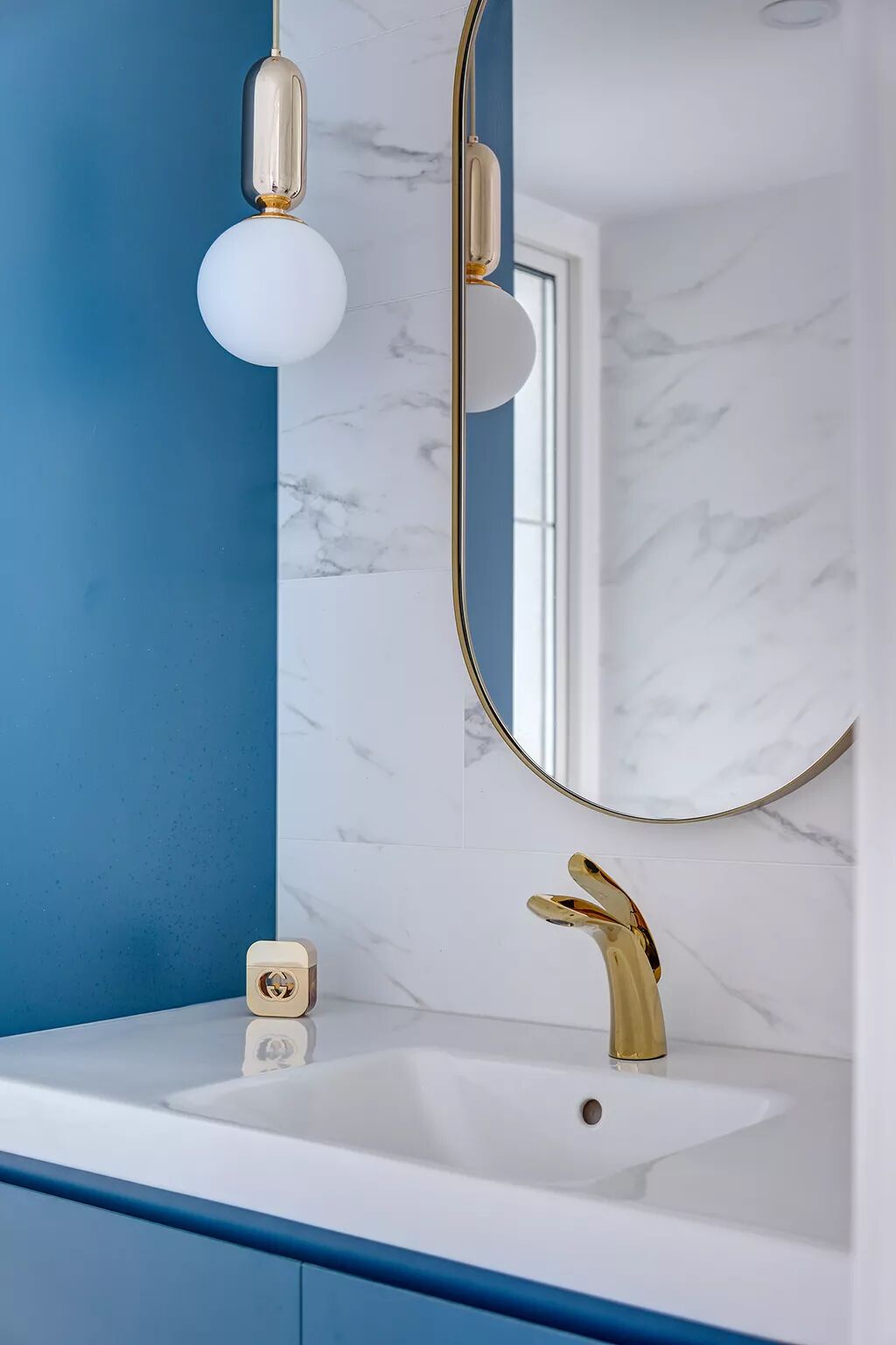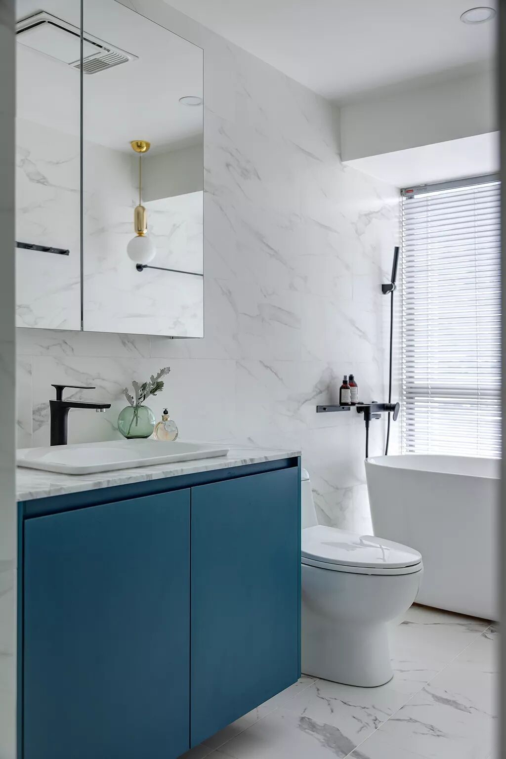 白色简单却能搭配所有颜色,而且,还能让卫浴间更清爽、开阔,搭配蓝色浴室柜与金色小五金,打造典雅大气之感。