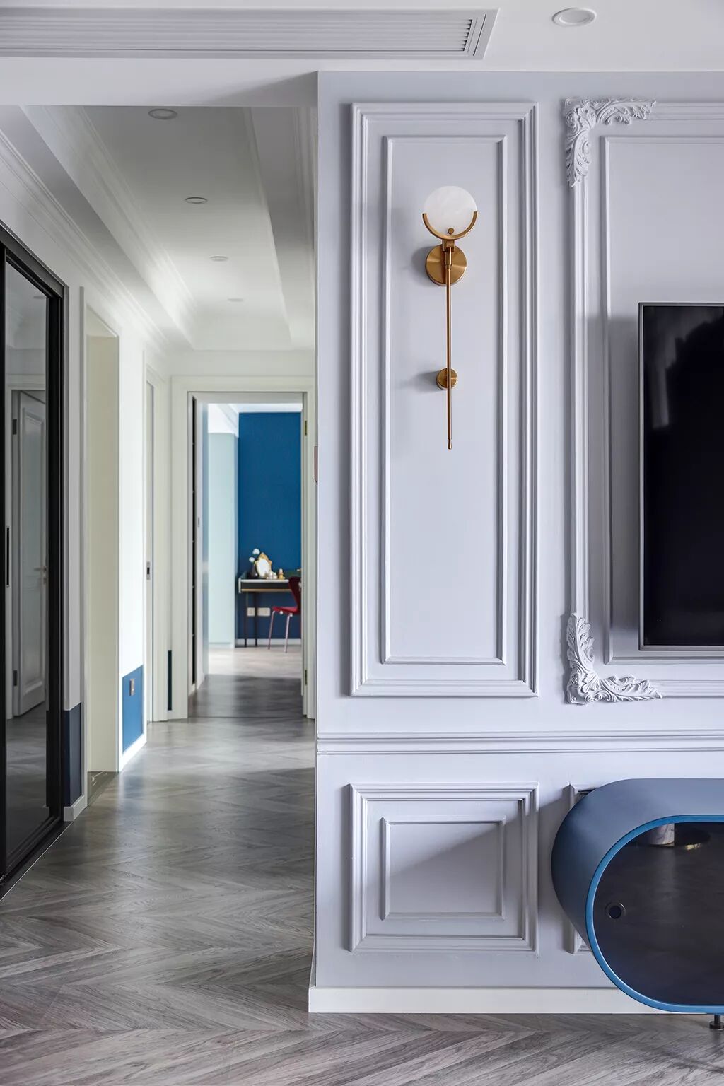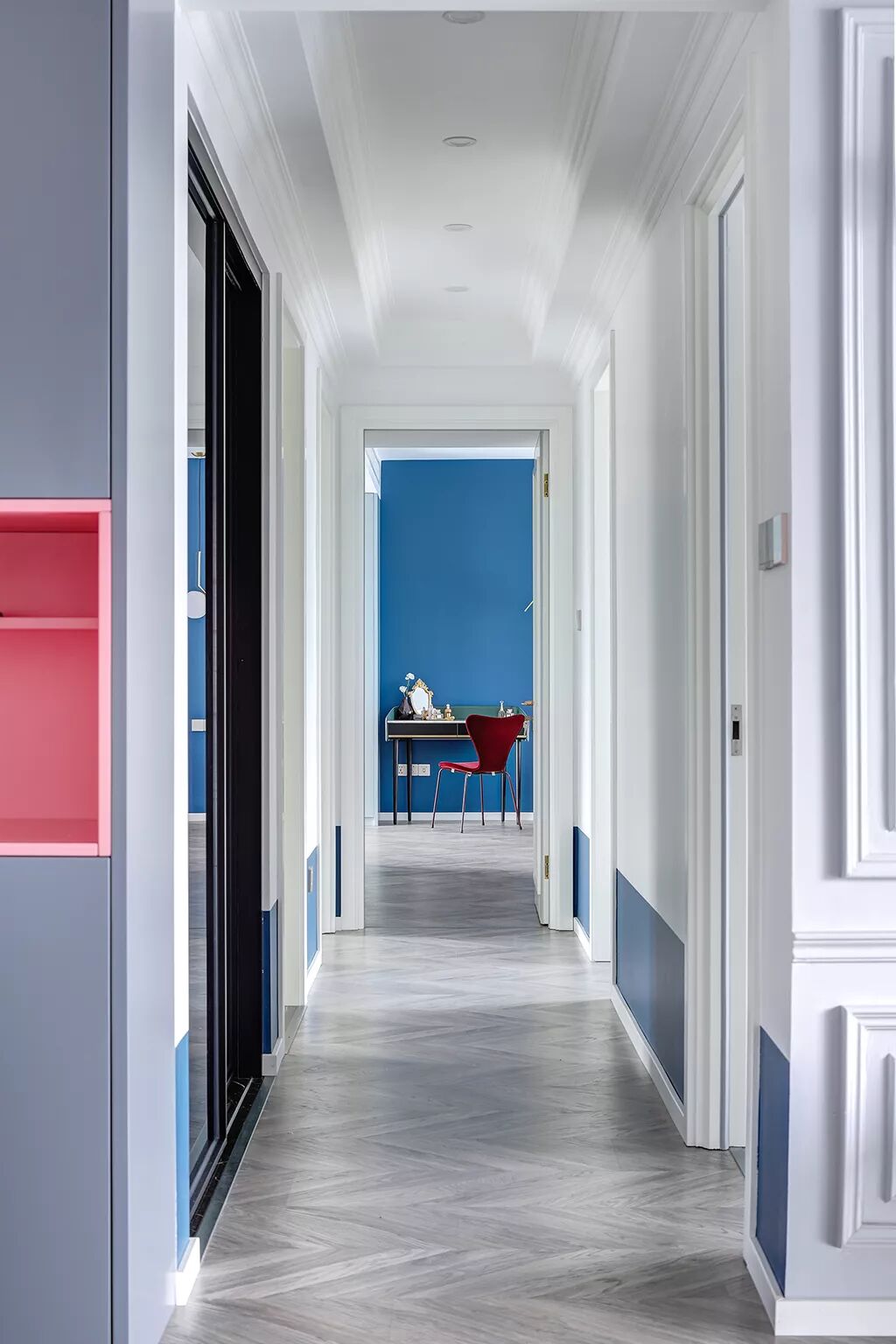 蓝色墙漆与主卧的背景色一致,以过道为延伸,循序渐进,整体感强。