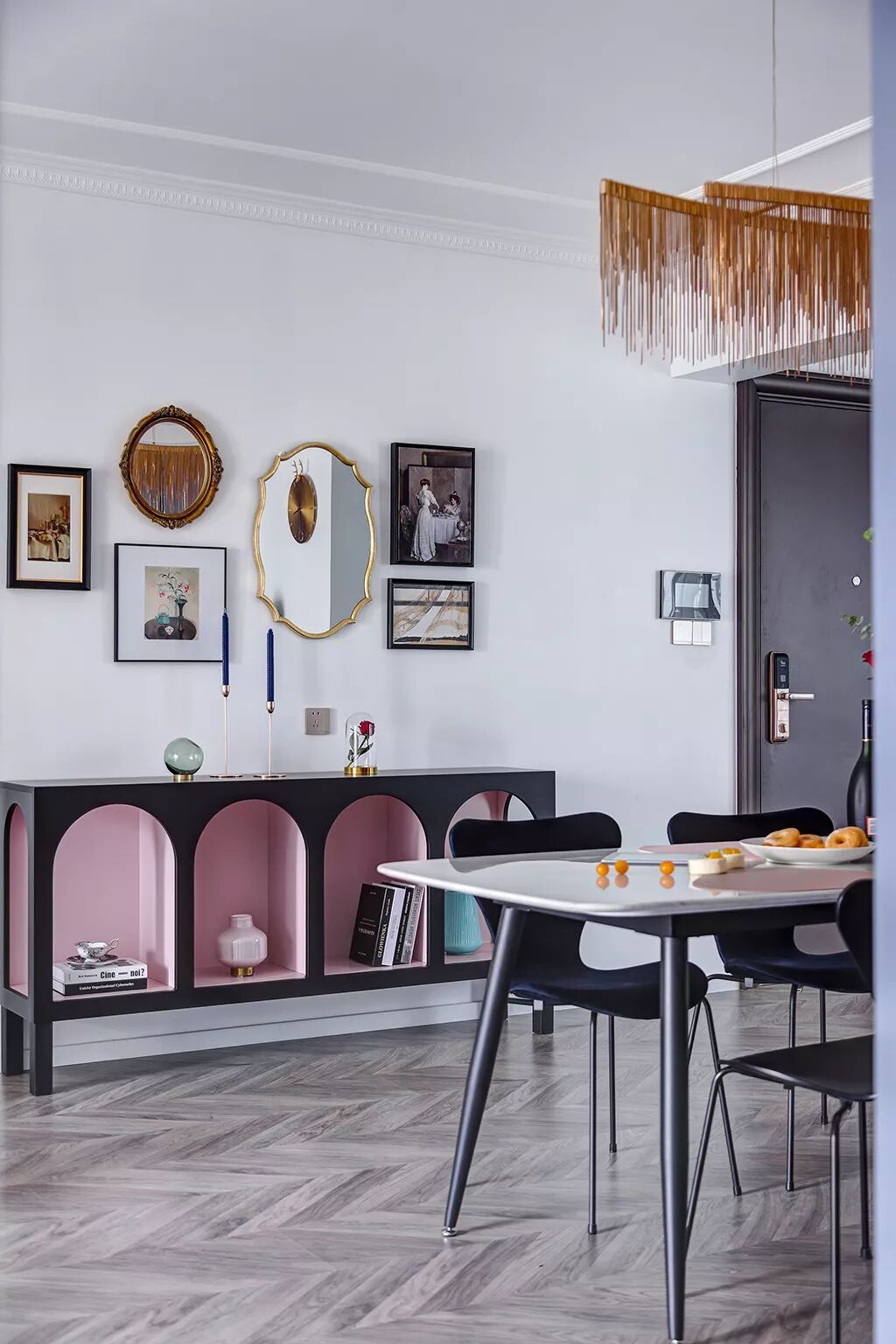 进门便是一抹明媚抢眼的粉色,穿透在黑色烤漆餐边柜里,点亮一室的轻奢气息。