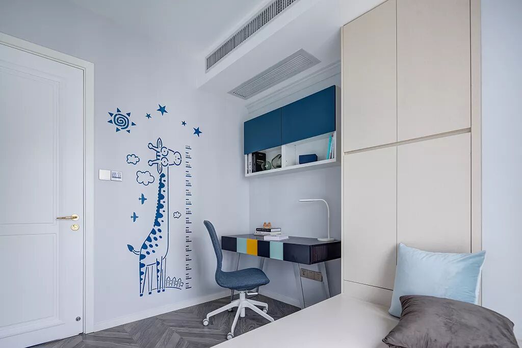 浅蓝色墙面搭配暖白色榻榻米,清新柔和的空间色调让书房更觉舒适。