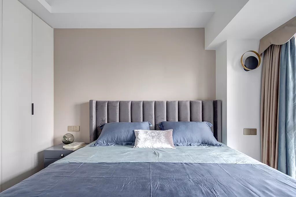 次卧是为父母准备的,奶茶色墙面配上灰色绒面软包床、雾霾蓝色床品、浅金色腰枕,温馨淡雅的色调将卧室空间打造得雅致文艺、闲适淡然。