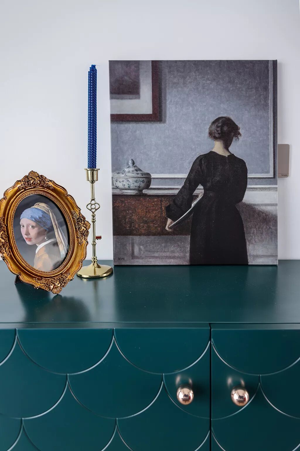 床尾的墨绿色鱼鳞纹斗柜也甚有韵味,金属球体拉手和别致的金属脚更是让人心生欢喜。