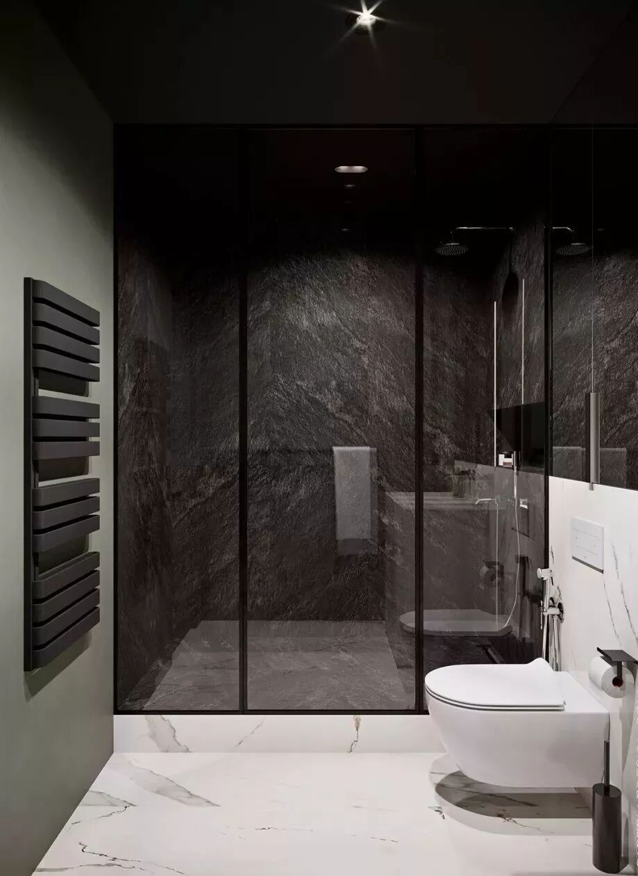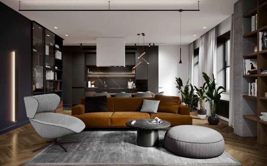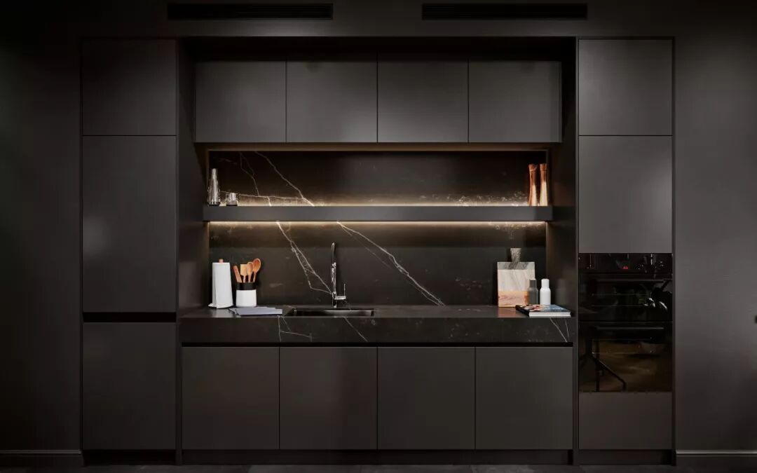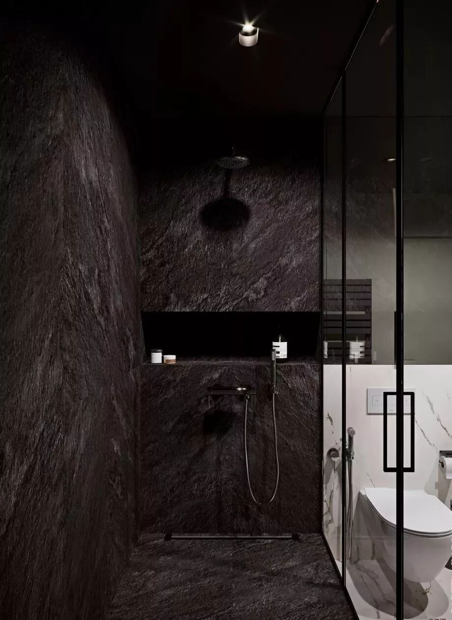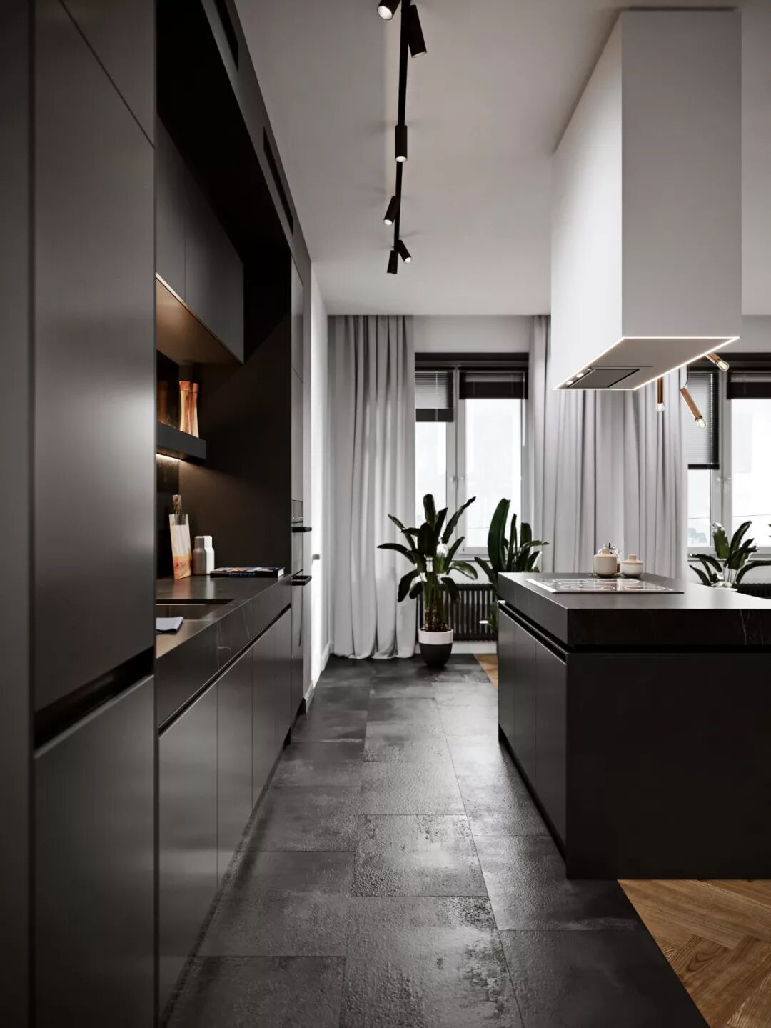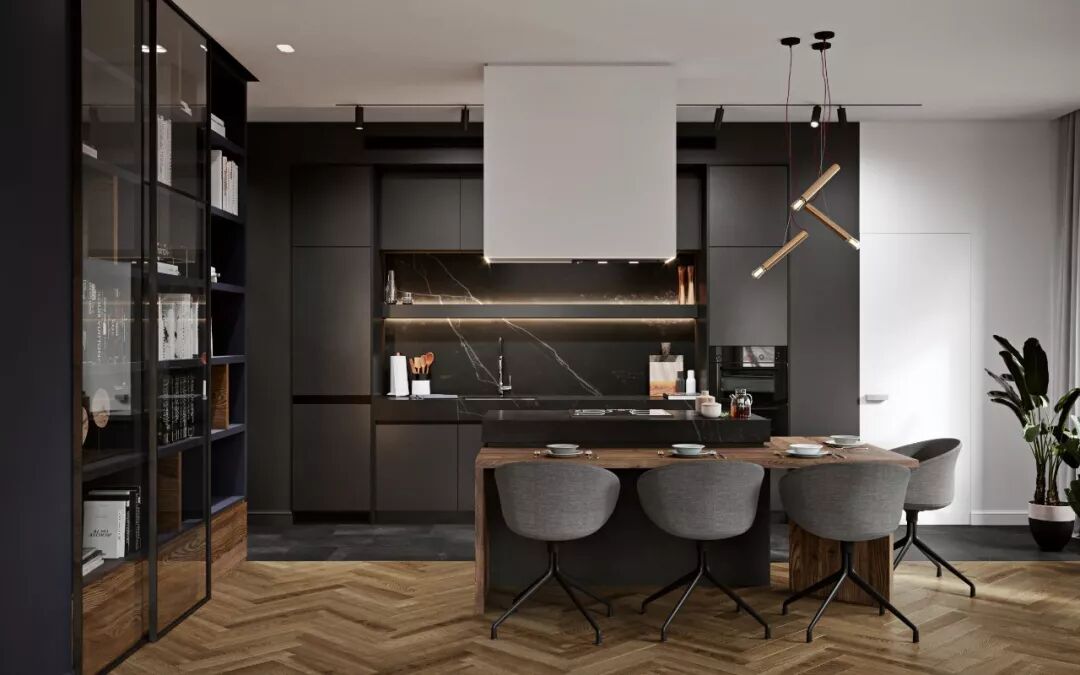 木质餐桌穿插在黑色大理石台面,形成中岛
