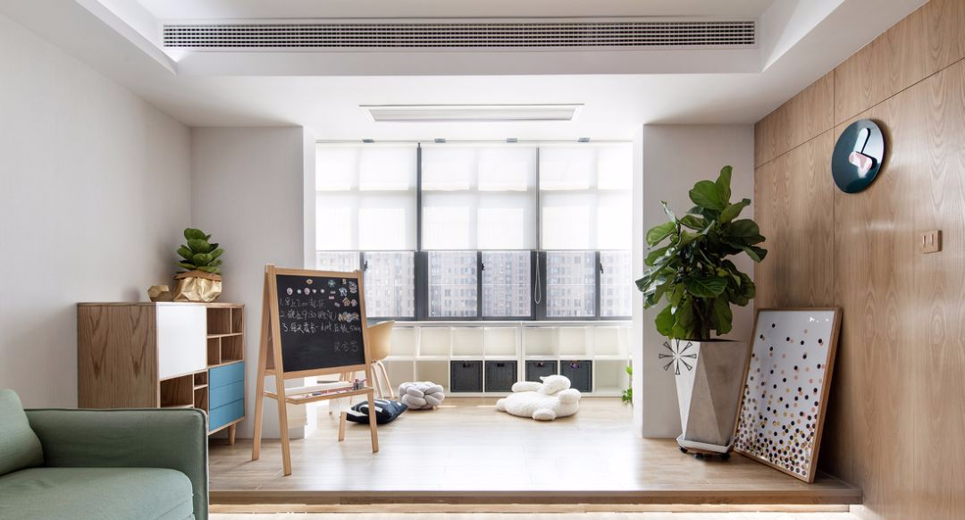 ▲ 在阳台给小朋友们归置了一个活动区,抬高地台与灯带的设计,给空间增添了一份俏皮。