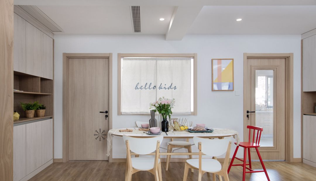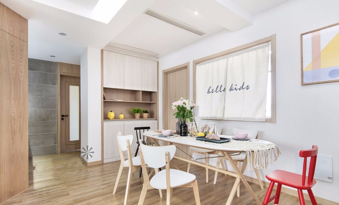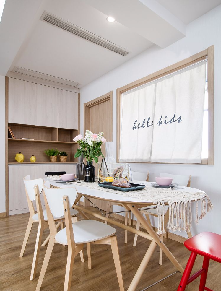 ▲ 餐厅整体延续客厅原木与白的风格,搭配木质地板展现温和调性。