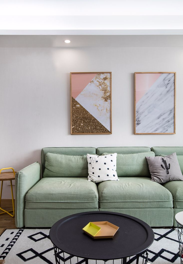 ▲ 浅绿色布艺沙发为空间整体增添生气,衬以柔和的色彩作为点缀,镂空茶几让空间感得以保留,简约而有质感。