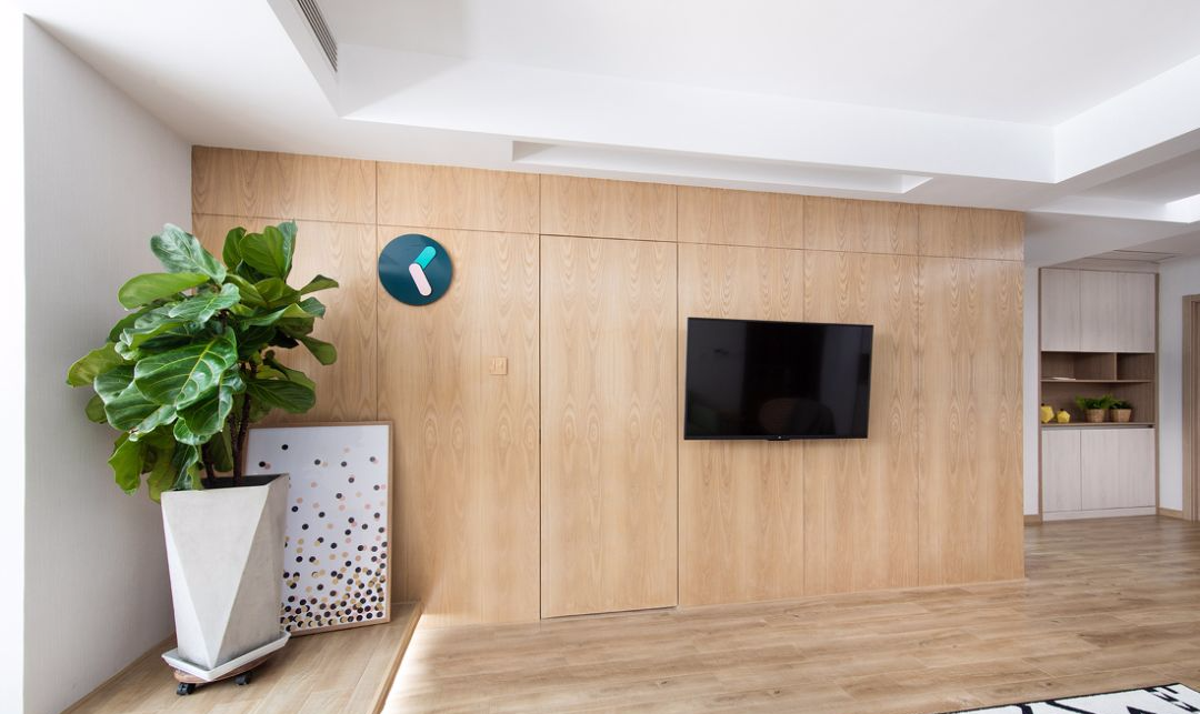 ▲ 电视背景墙采用隐形门的设计,温润的原木色加上大面积的白色,给予客厅空间最大的视觉舒适度。