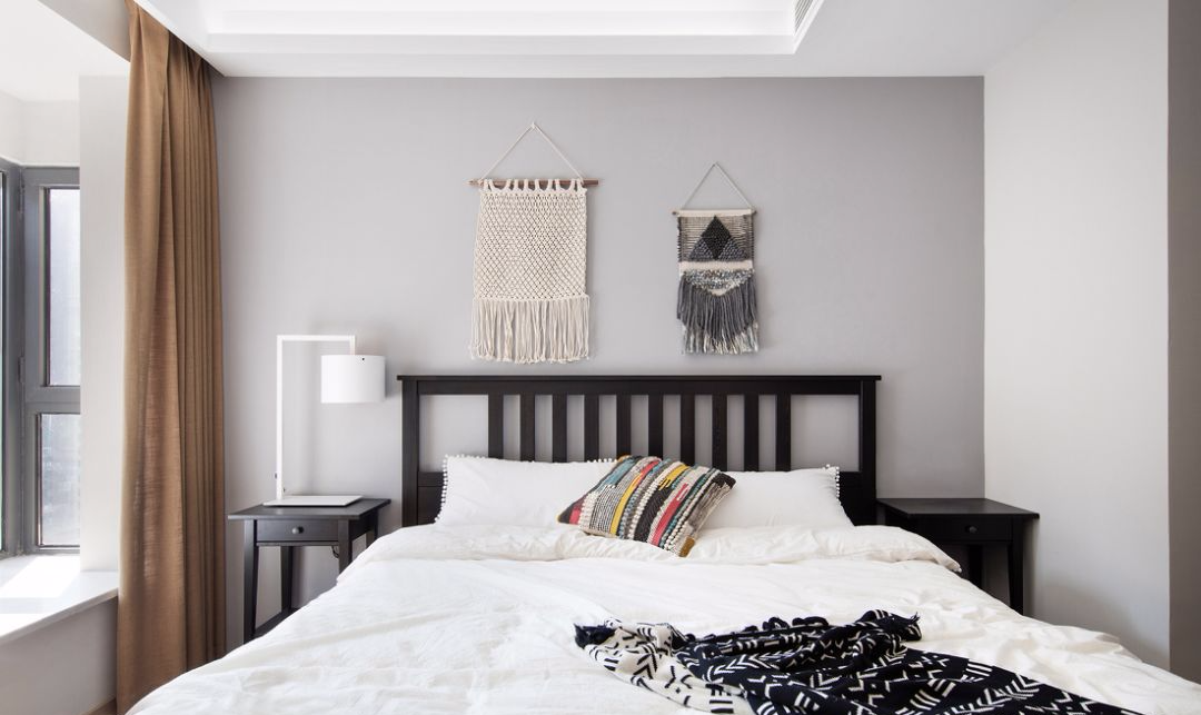 ▲ 主卧以黑白灰为主调,简约干净、自在随性。暖咖色窗帘搭配柔软的针织品,中和了空间中的冷淡感。