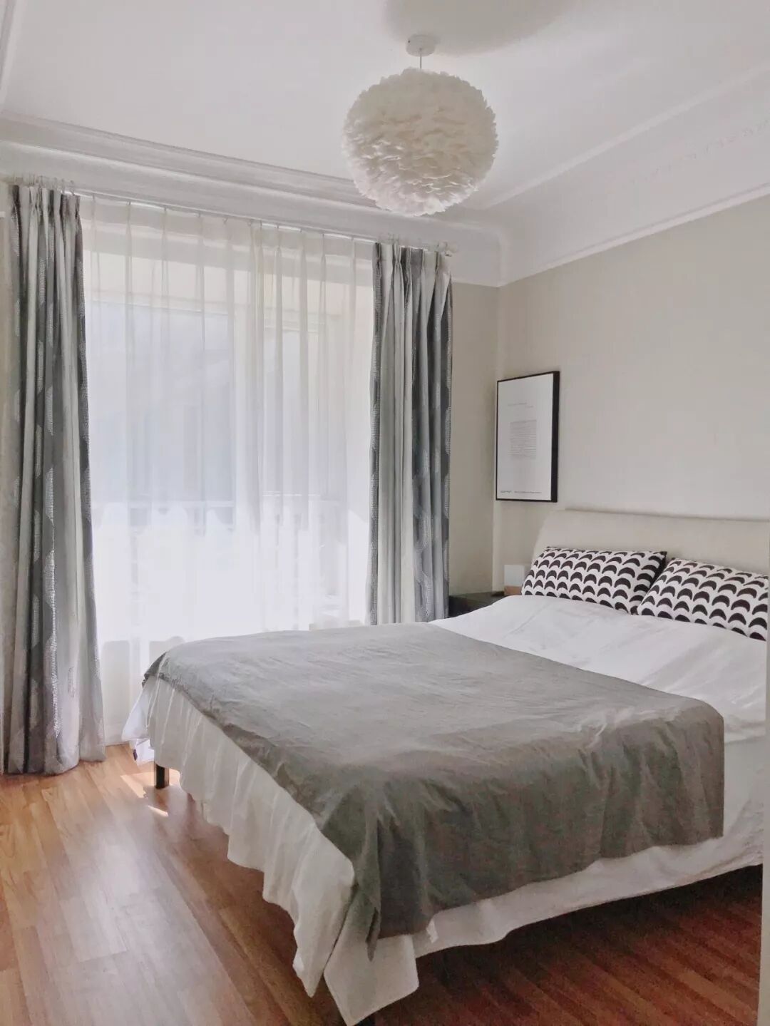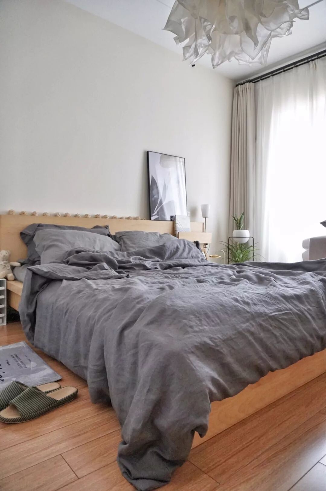 灰色系的木地板搭配灰色系的床品和白色的墙面,显得非常的素雅。