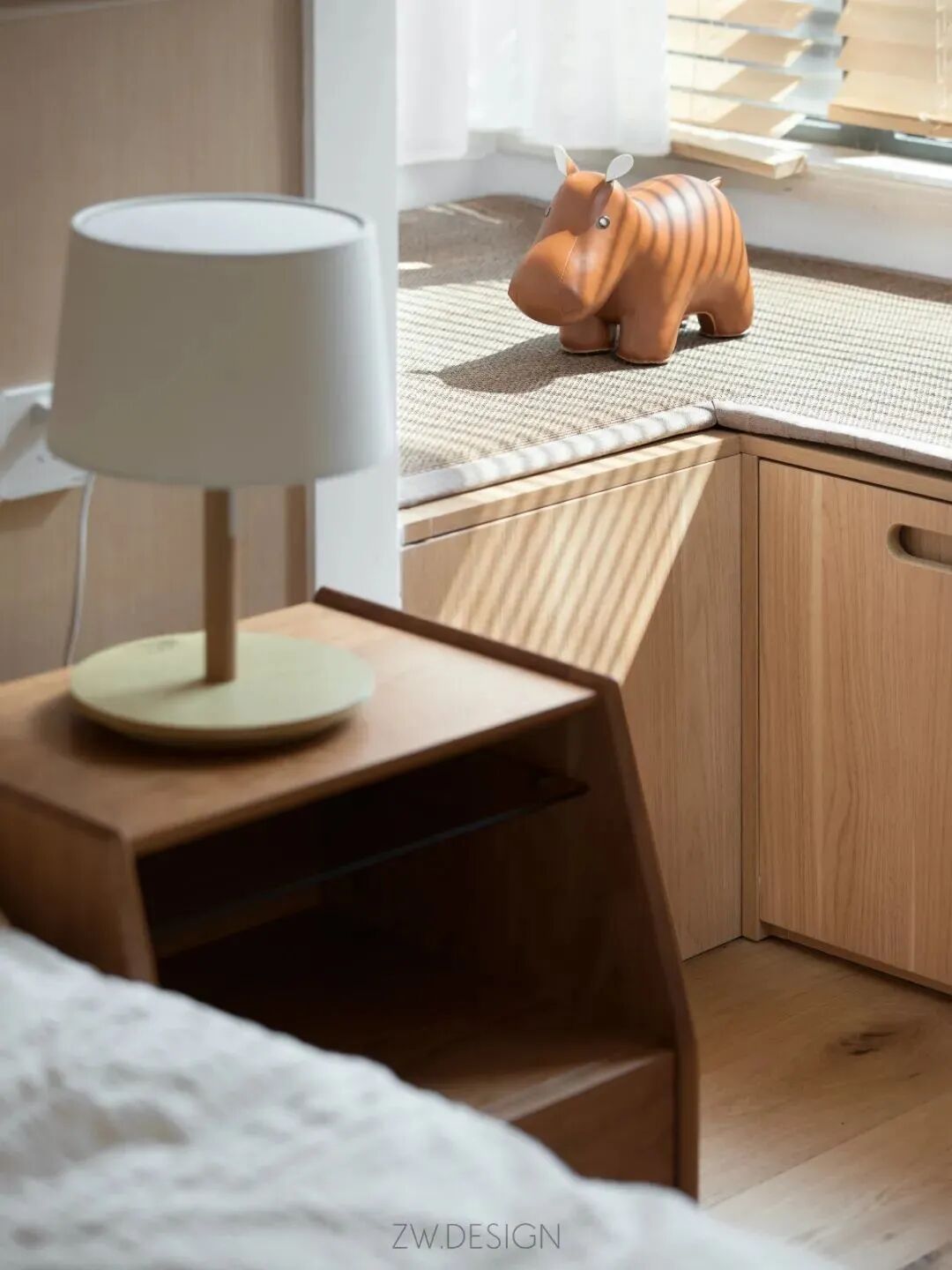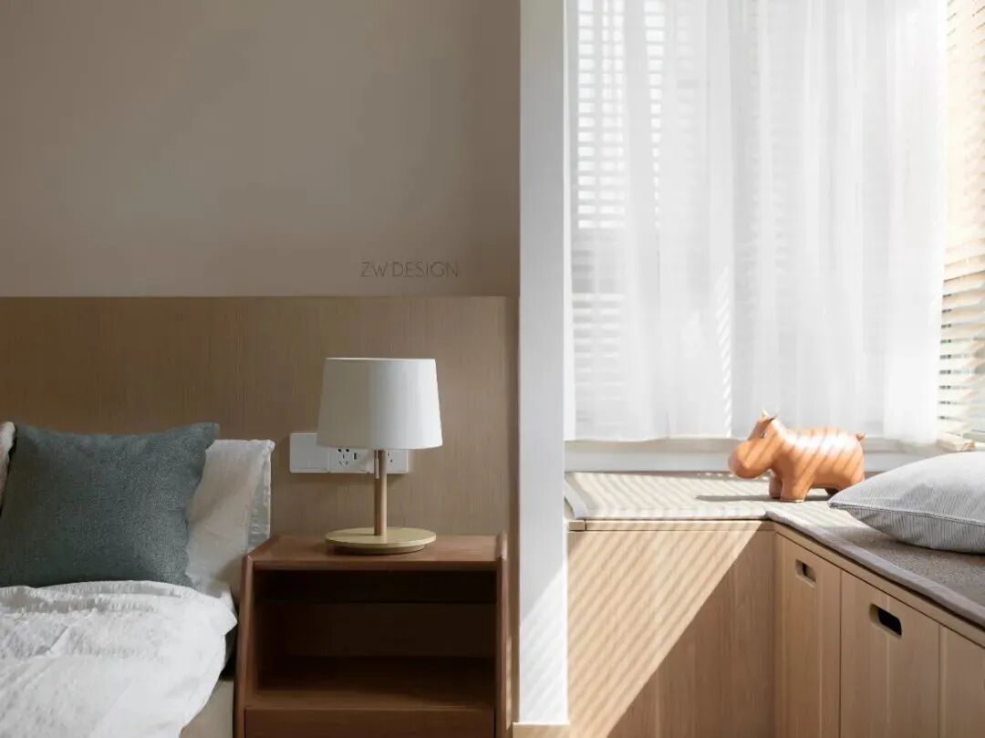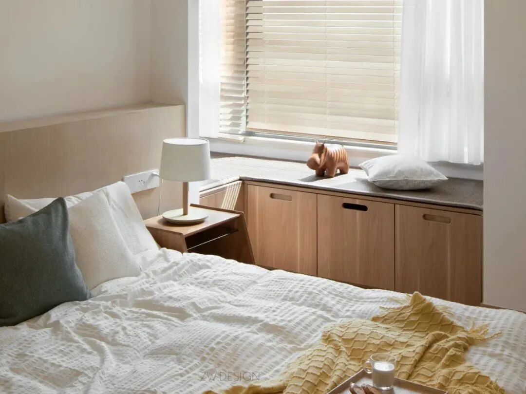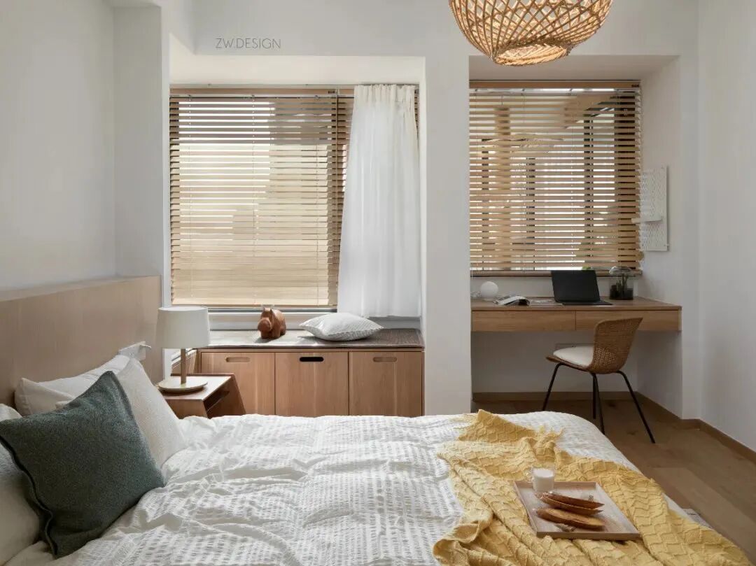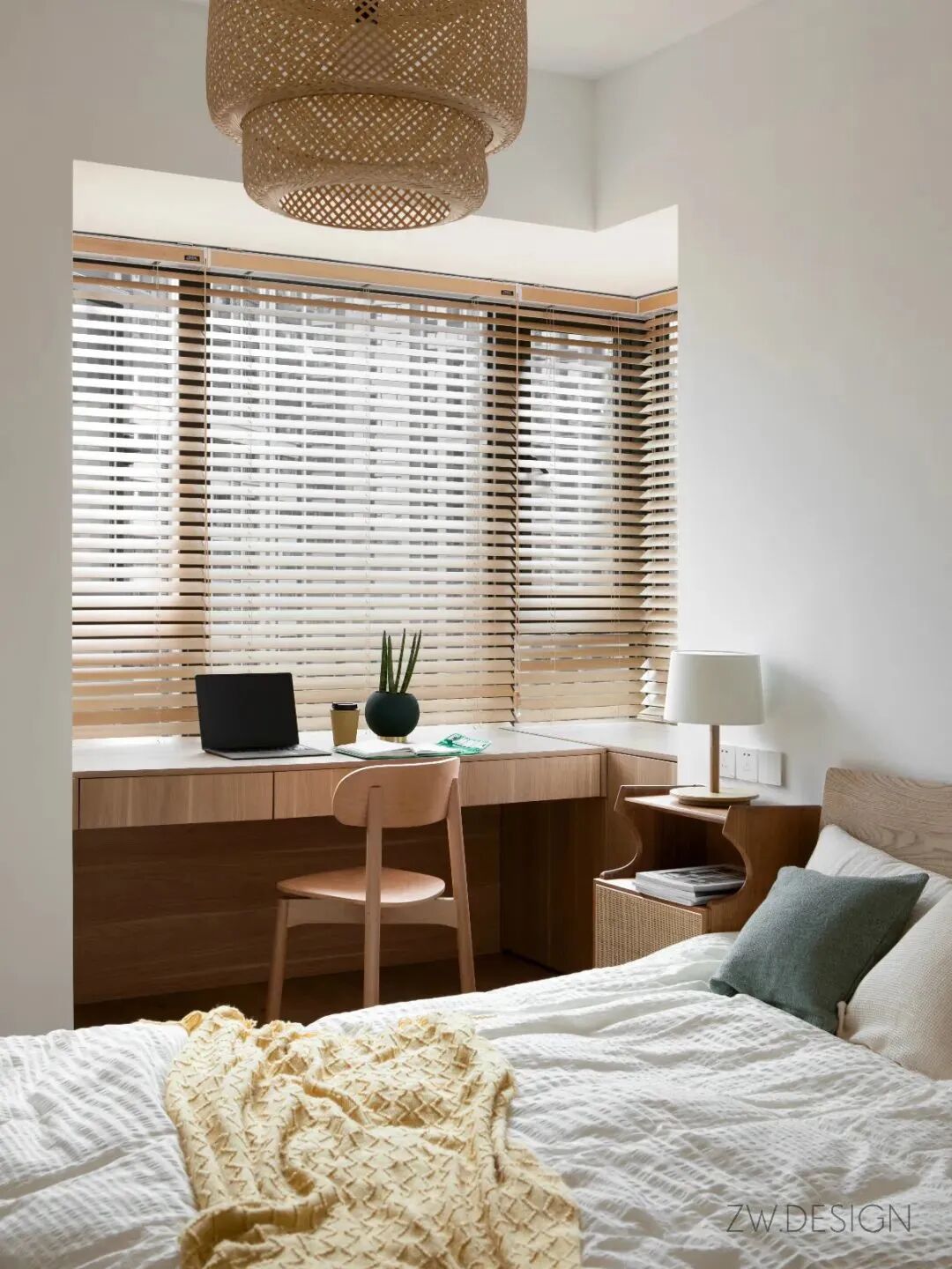 ▲主卧以定制床的设计,靠窗位置分别设置定制飘窗与书桌,书桌椅悬空式的设计,加入木色的百叶帘,也让卧室具备了更加简约自然的氛围。无论是休闲睡觉,还是工作游戏,都从容舒适。