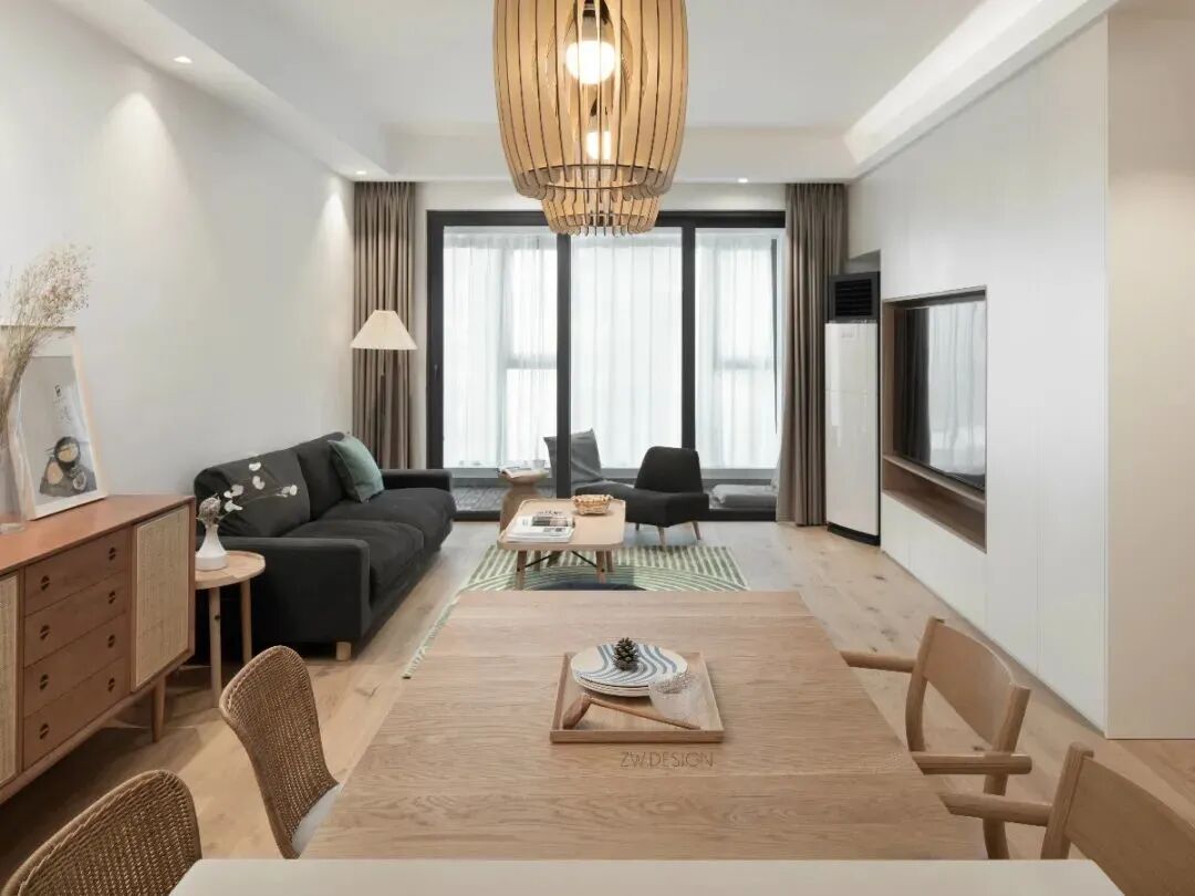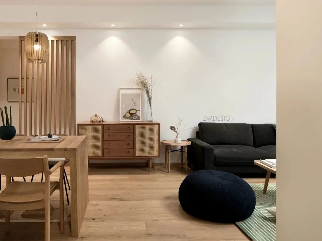 ▲改造后,在沙发旁边布置一个斗柜,连着过道区域装一个木质屏风,加入编织灯罩的灯具,也让空间显得充满原木自然的气息。