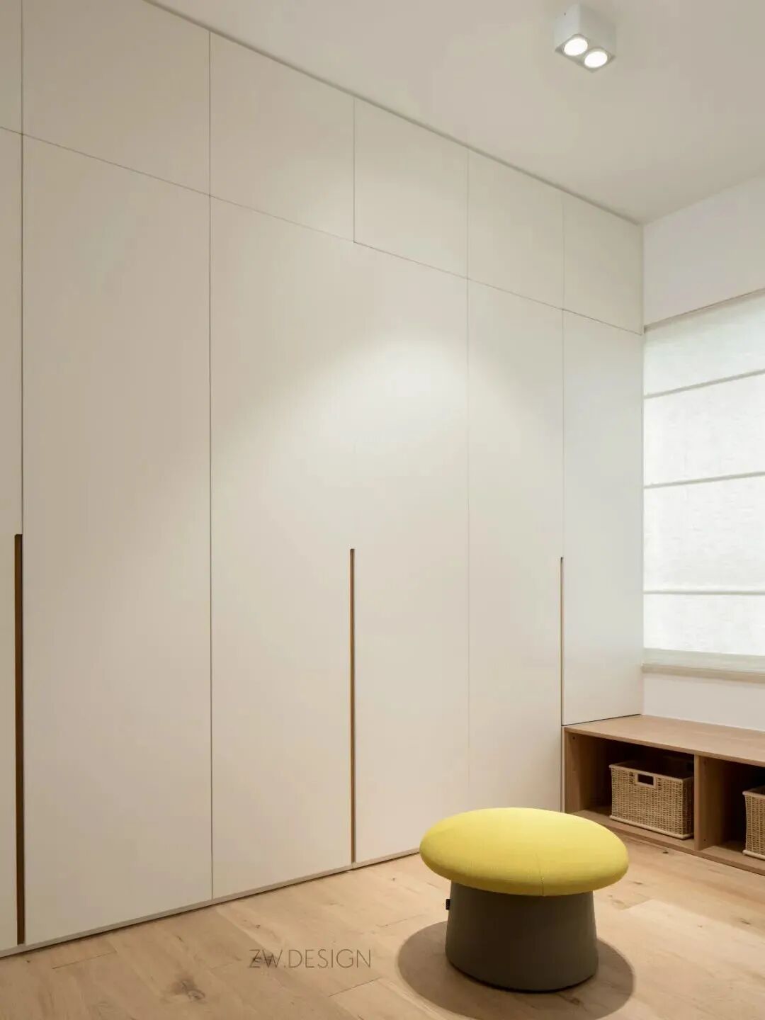 ▲衣帽间靠窗位置装上飘窗柜,飘窗柜底部留空加入收纳篮,提供灵活的小物件存放。中间位置摆上一个活泼黄色的小凳子,定制上实用的衣柜,让主人衣物收纳有了充足方便的位置。