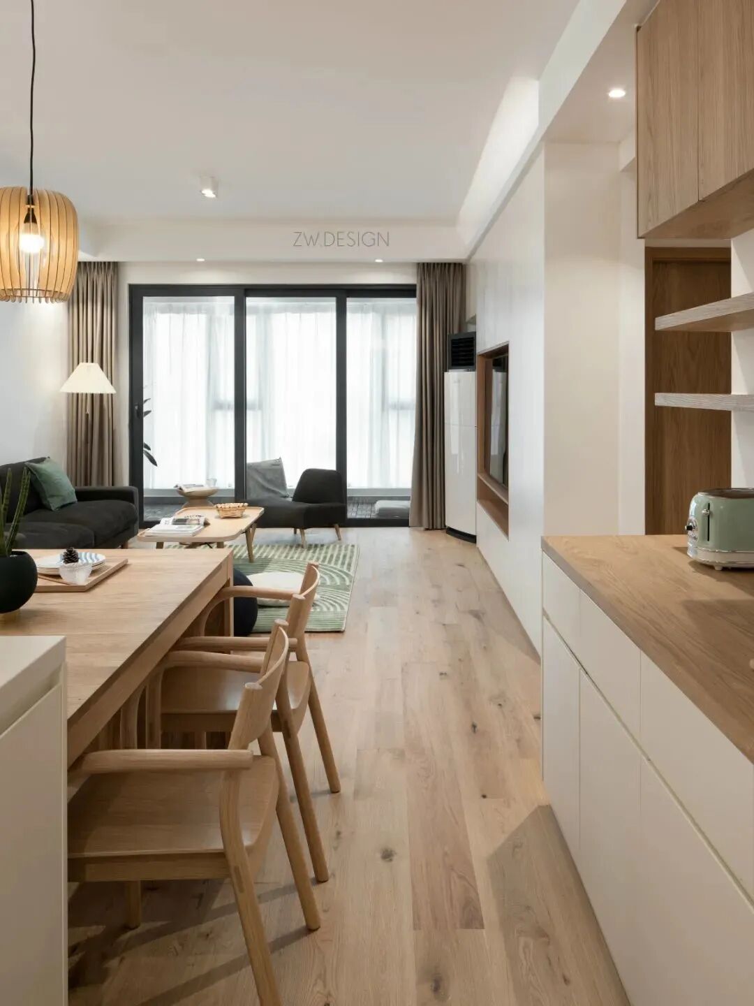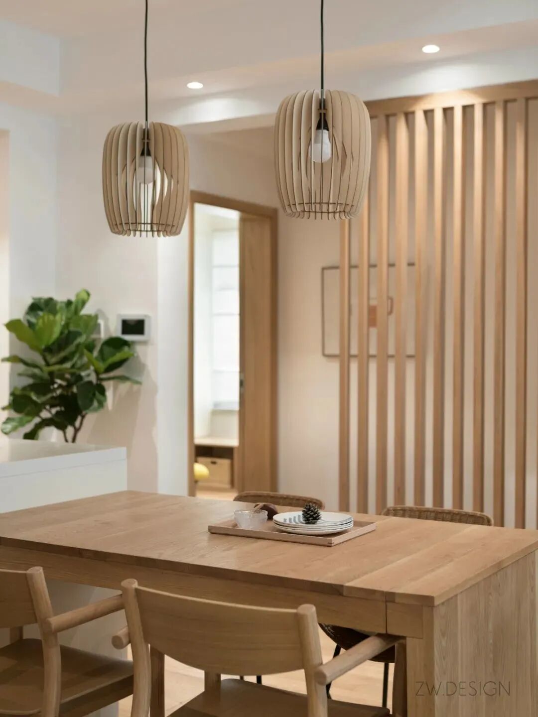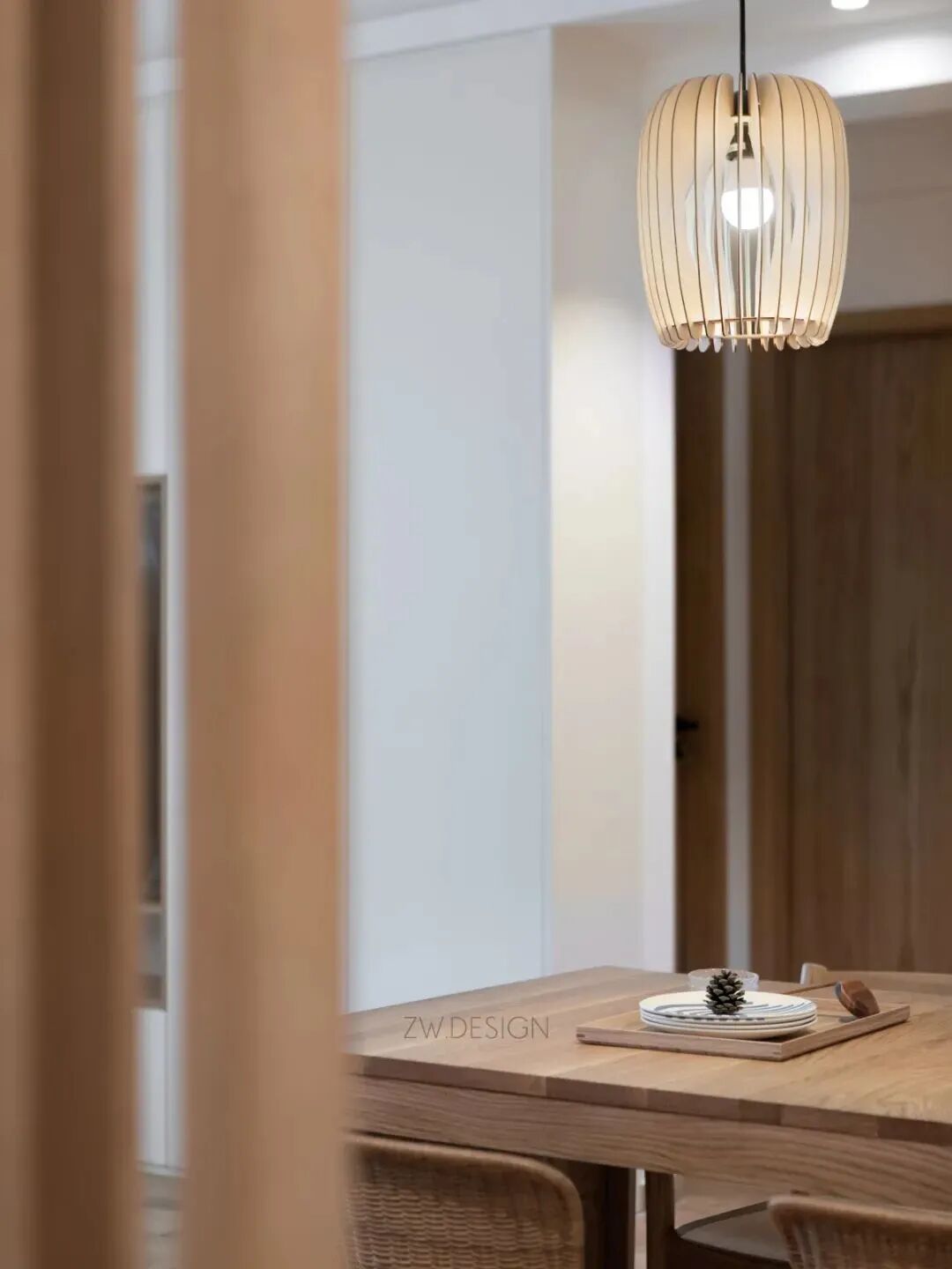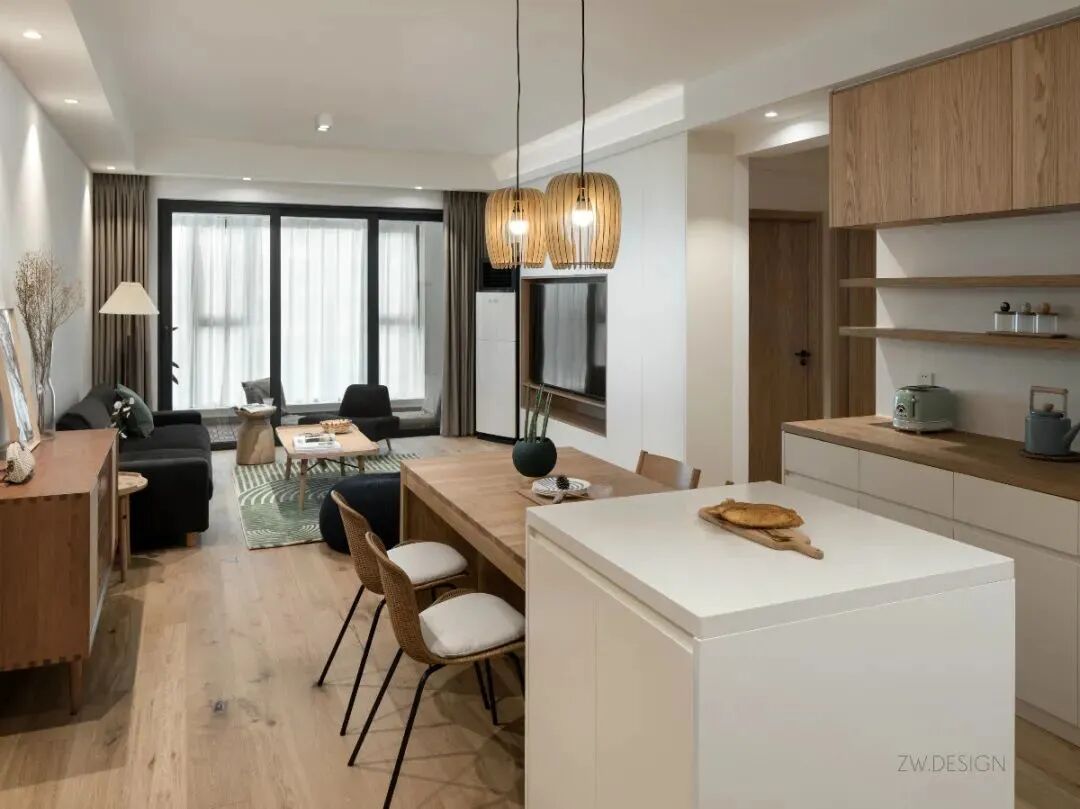 ▲原木餐桌挨着白色的中岛台布置,餐桌上方是编织灯罩的吊灯,也让餐厅区域的照明更加温馨,营造出时尚而简约舒适的用餐氛围感。