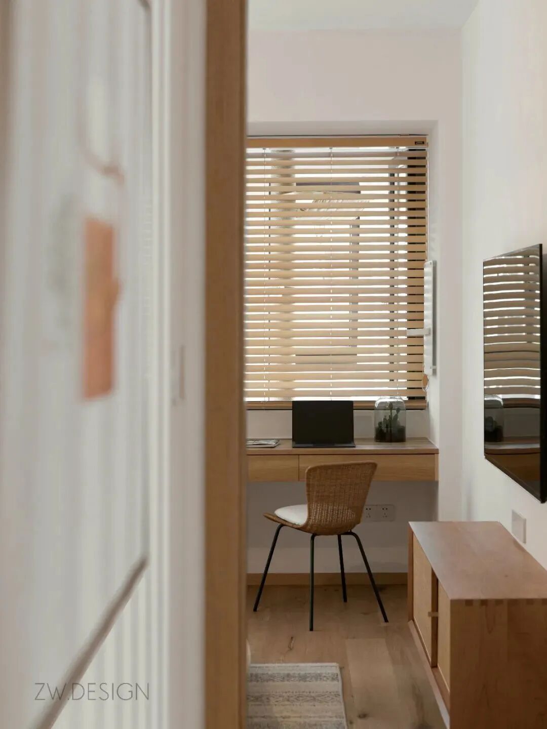 ▲次卧空间相对紧凑,布置实木床,靠窗位置定制书桌,装上木质百叶帘,整个空间充满简约明亮的实用与温馨感。小小的空间,却也是功能丰富、令人舒适。