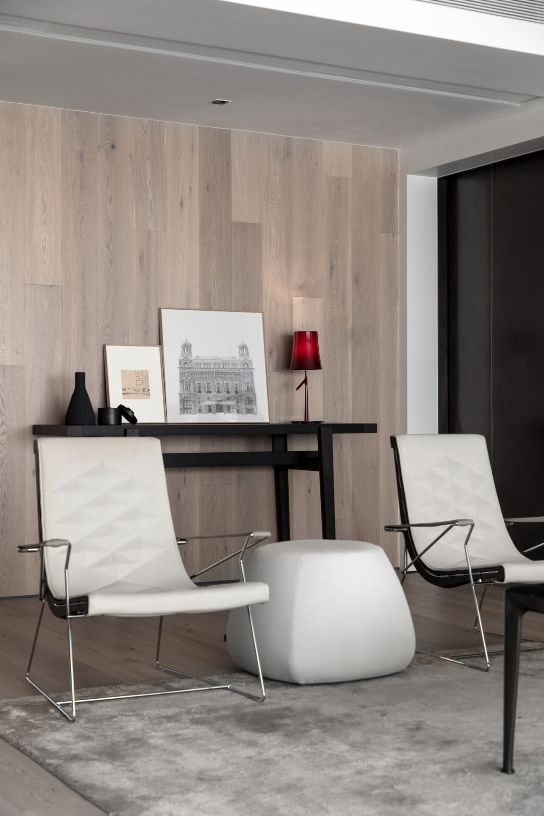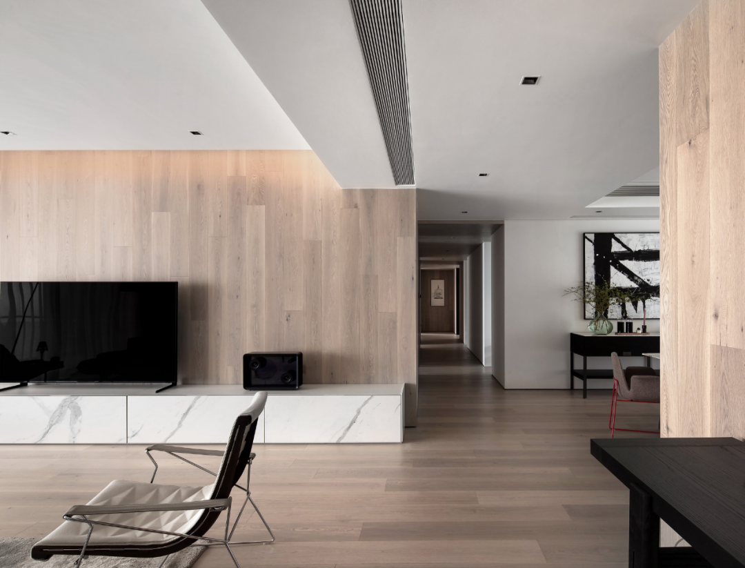 望之俨然,即之也温,木材历来都是最能代表自然的材质,作为当代设计潮流趋势,它被大面积运用到本案当中,并经由设计师巧妙处理,成功上墙登顶。