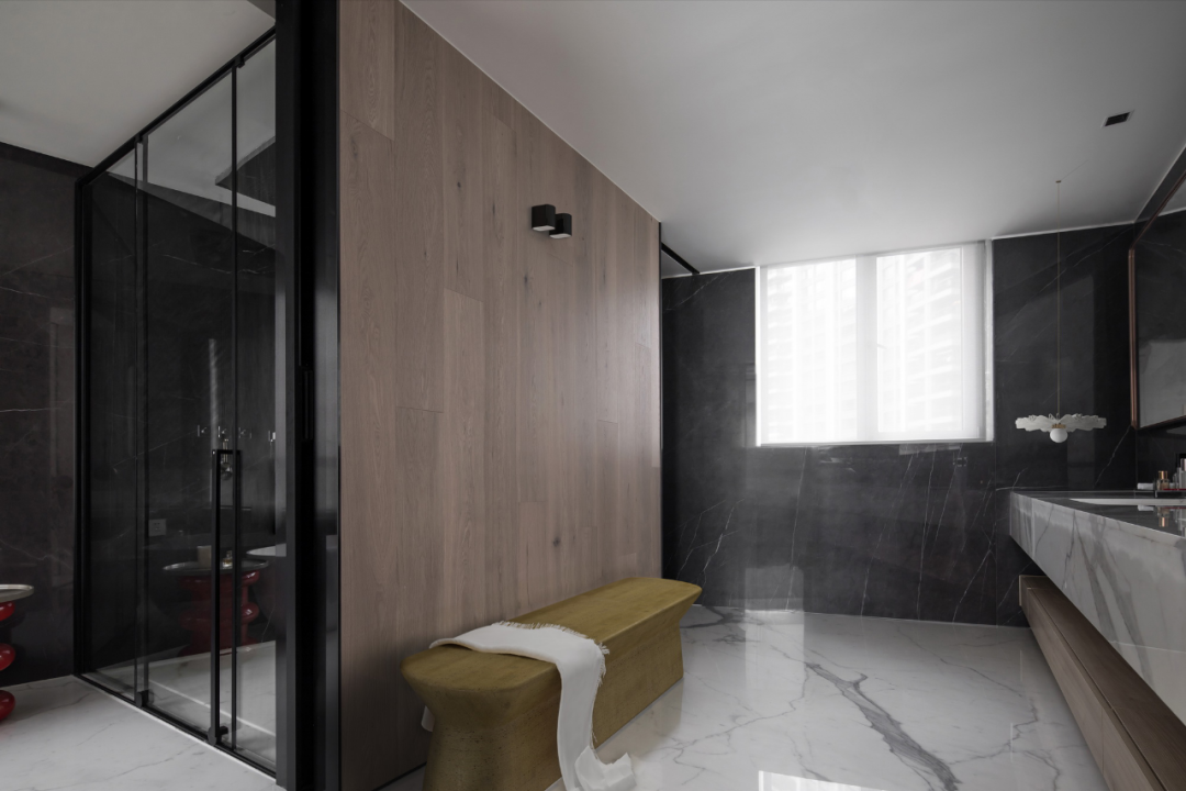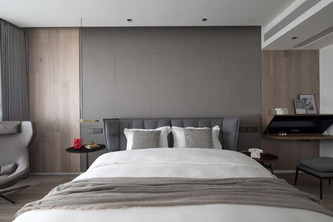 原木材质与高级灰的巧妙搭配、卫生间的独特性以及在细节摆件上的精雕细琢,将业主对美的理解、对生活的追求凝结淬炼,立足于当下,在简约的空间内注入来自于东方的留白的概念,最终构造出了这拥有不凡气质的江景豪宅。