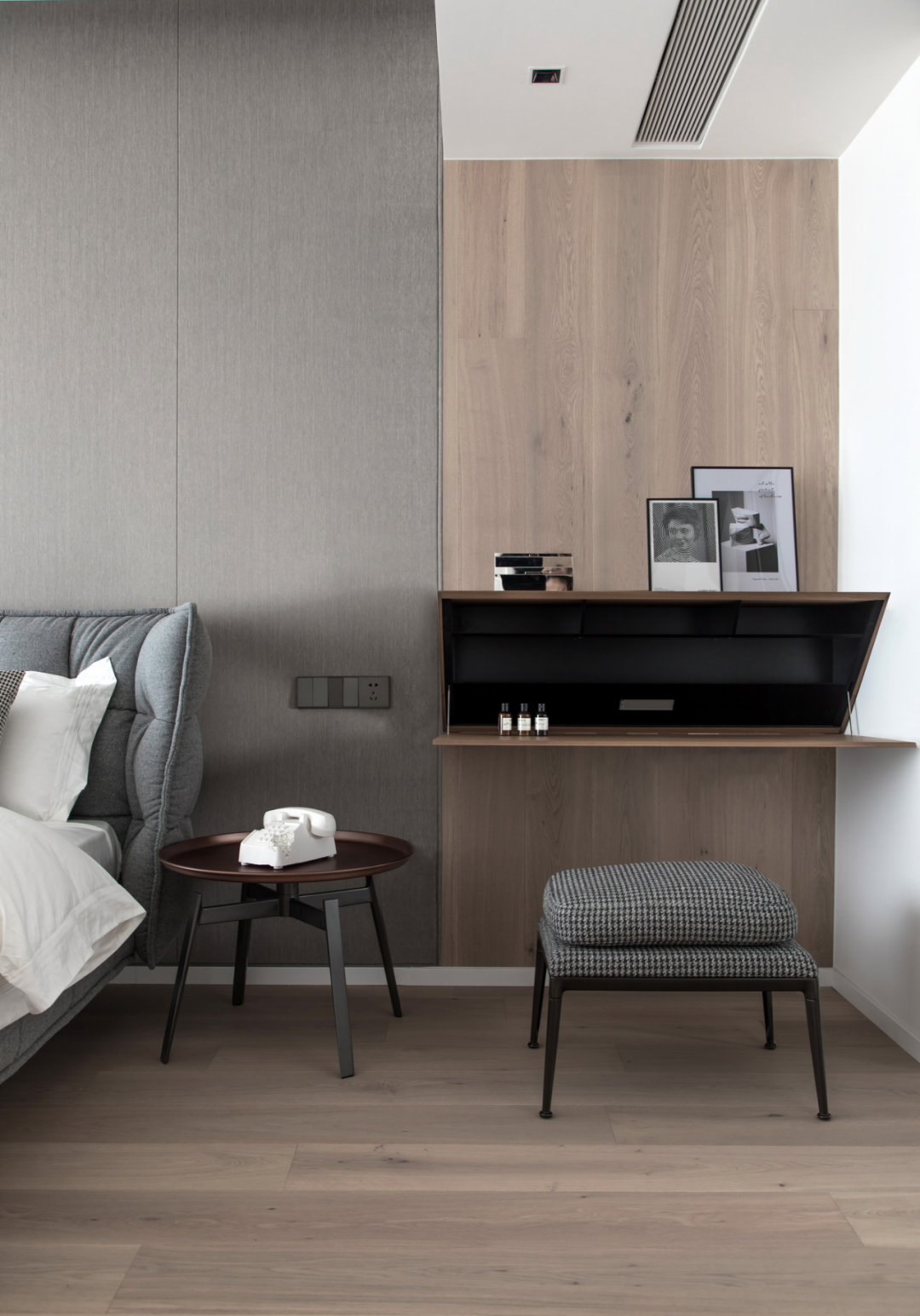 本案高级灰的独特与巧妙之处在于它不只是单纯的灰的组合。首先,它是以小块面的组合形式与大面积的原木相结合,用恰如其分的材质比例关系将当代流行美学与自然元素融于一室,展露出不凡脱俗的艺术质感。