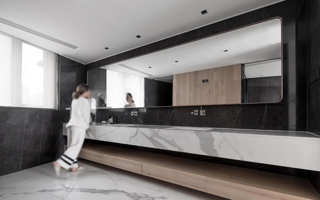 走入这个与主卧相连的开阔空间内,跃然映于眼前的便是一个长达4米的镜子,它静静的立于墙上,在创造了独特记忆点的同时无限放大空间尺度。