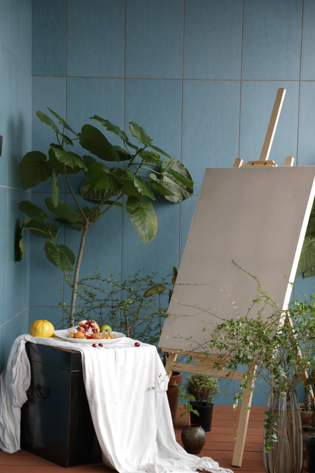 阳台盈盈绿意簇拥下的画板方便在江景视角下绘画同时象征着自然与艺术的交织;