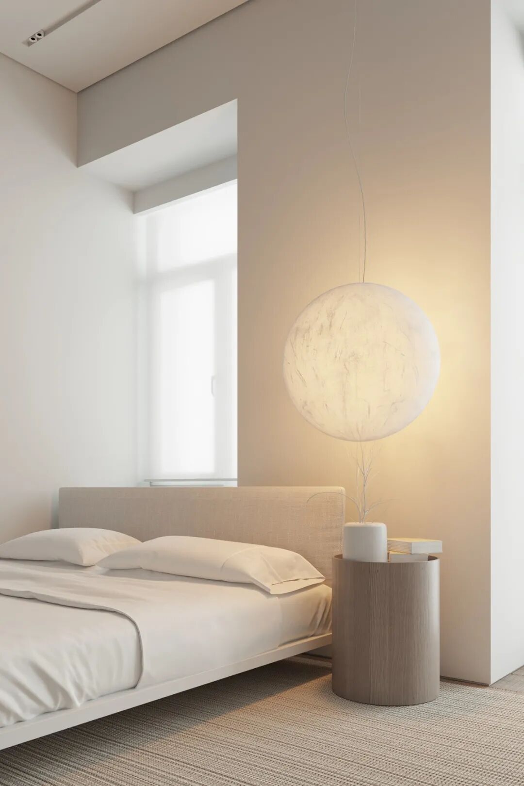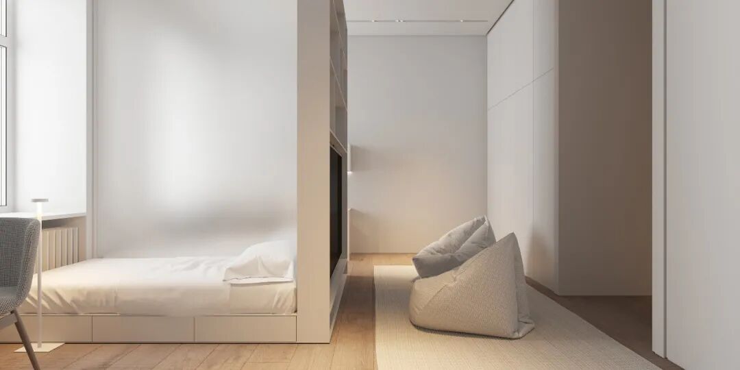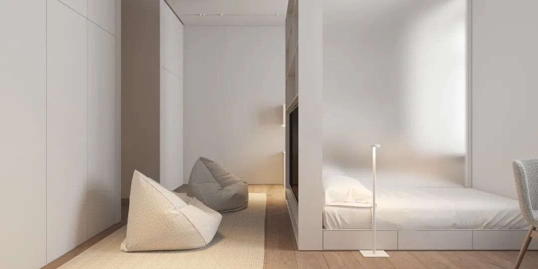 第四间卧室用作孩子的房间,设计了两张床,电视柜用作其中一床的背景,低色温光源的设计,整个空间光线柔和,让休憩氛围愈加静谧安宁。