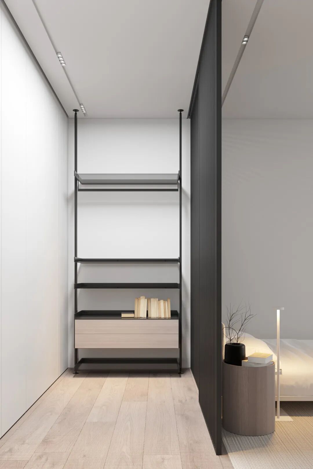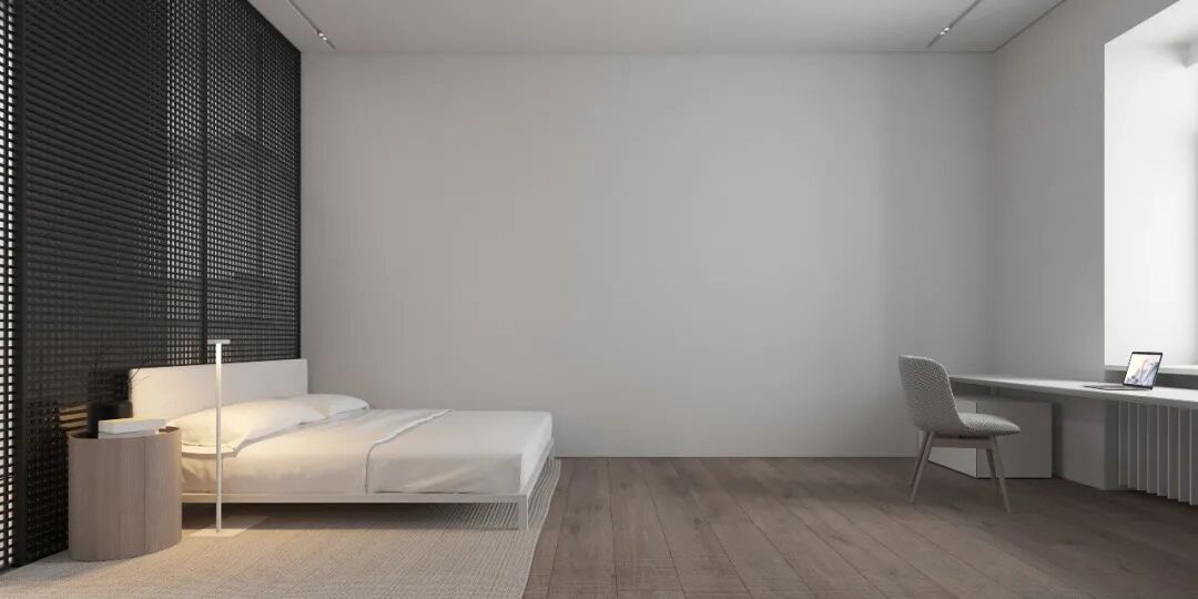 次卧无论是温暖的木质色彩、简洁的线条,还是留白的干净的墙面,黑色的栅格隔断,都让人内心是平静舒适的。