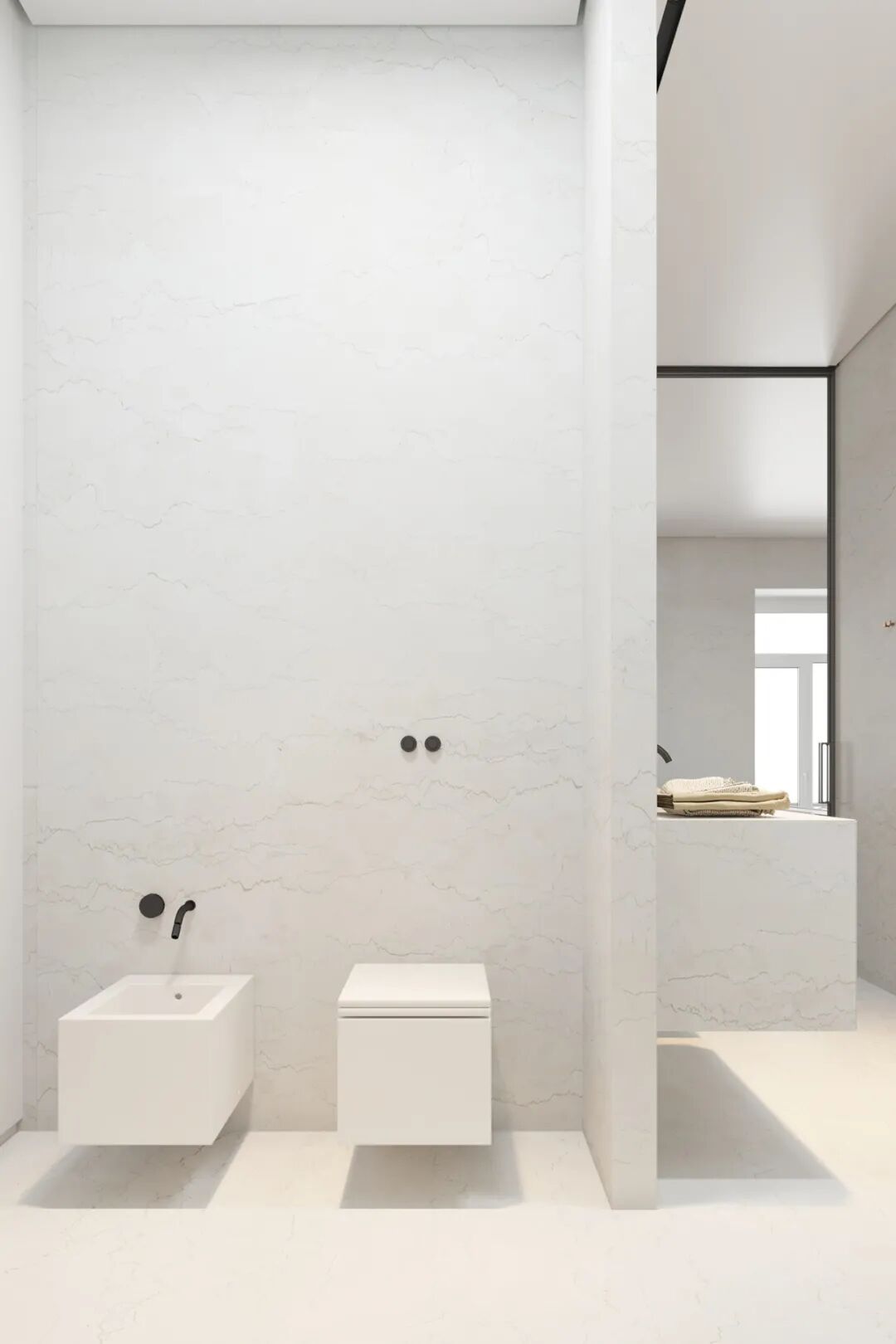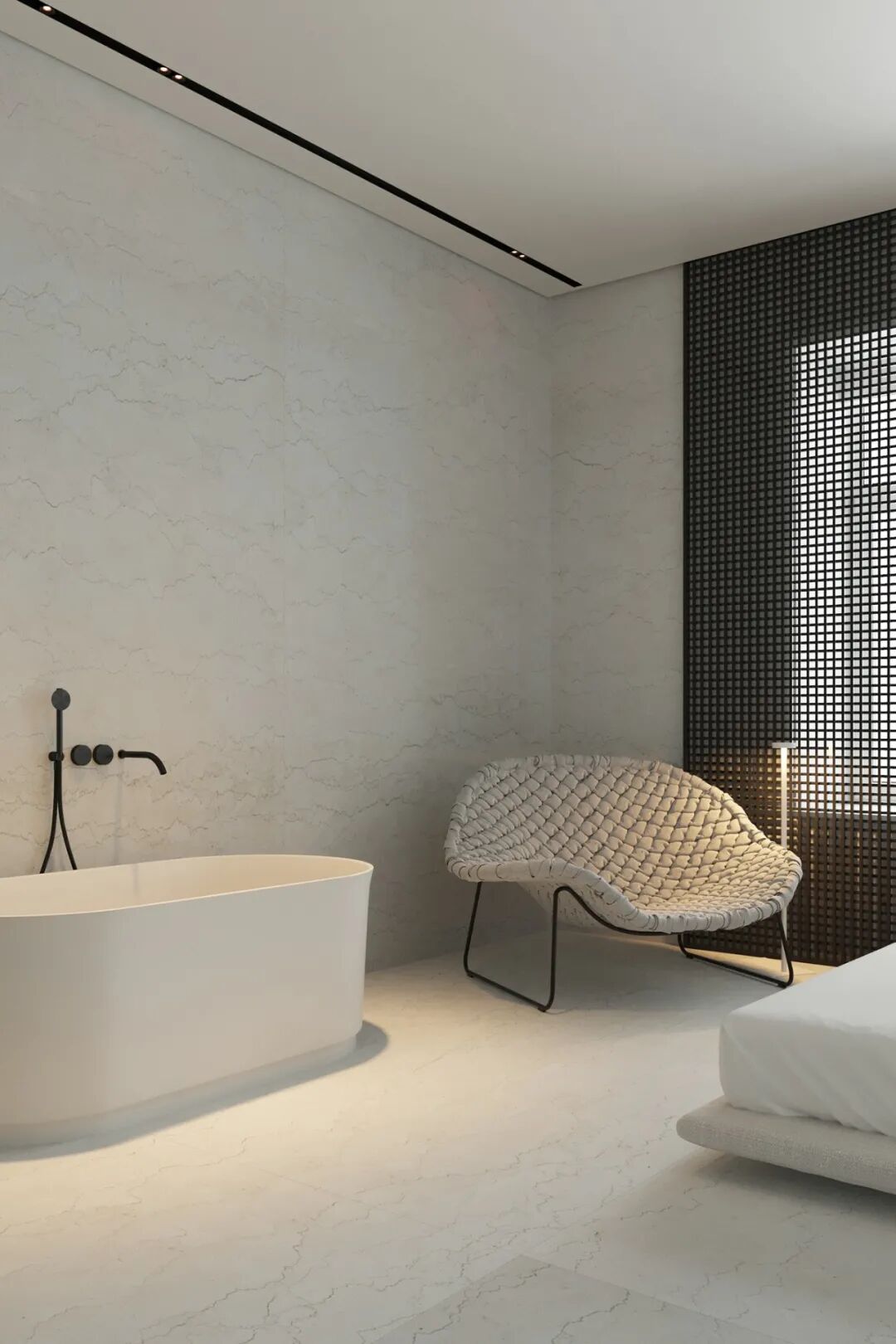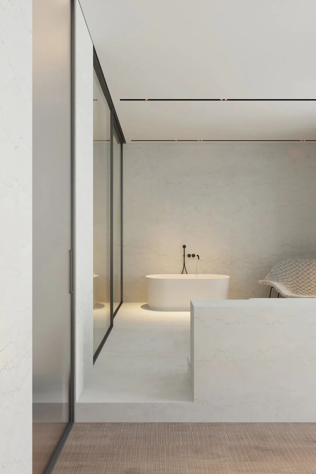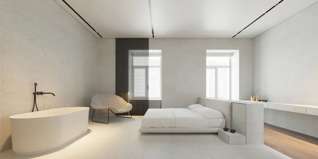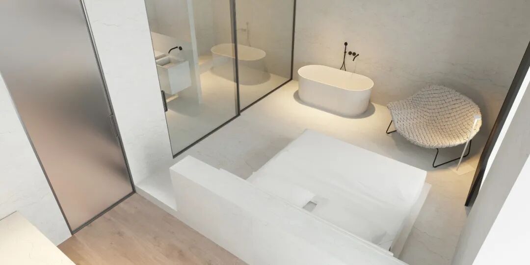 主卧宽敞明亮,休息区和卫生间用滑动玻璃门隔开,但浴缸却安置在休息区,是个空间弥漫着静谧安宁的氛围,舒适温馨。