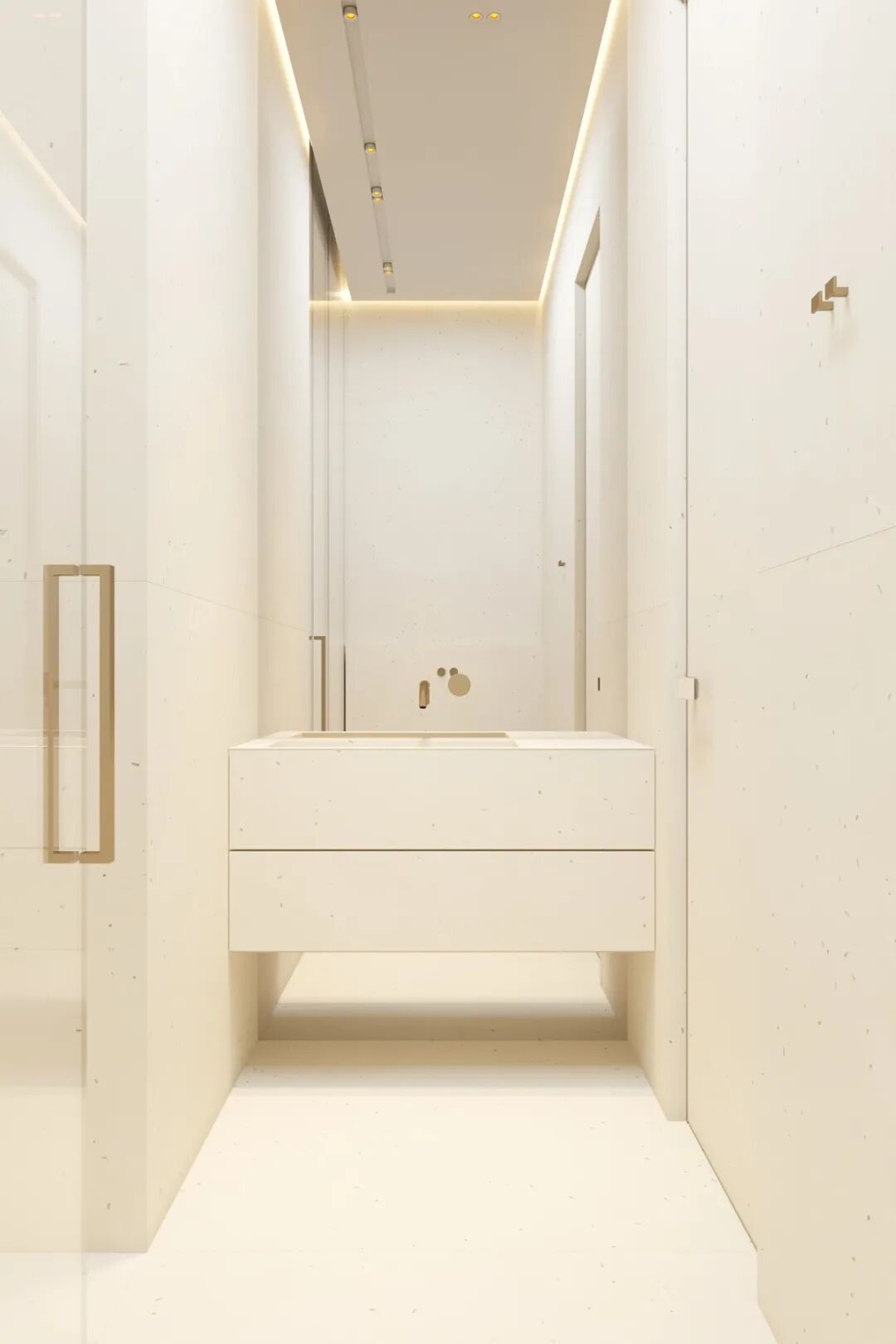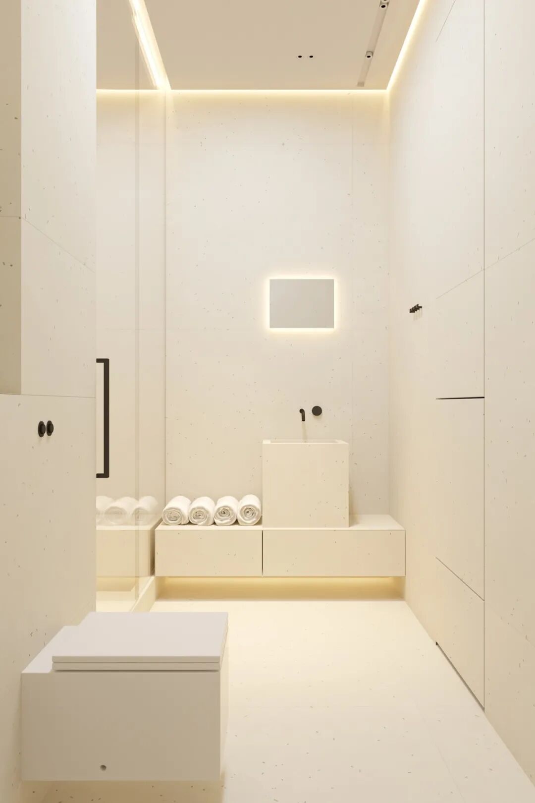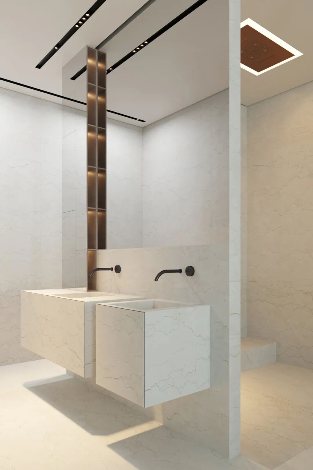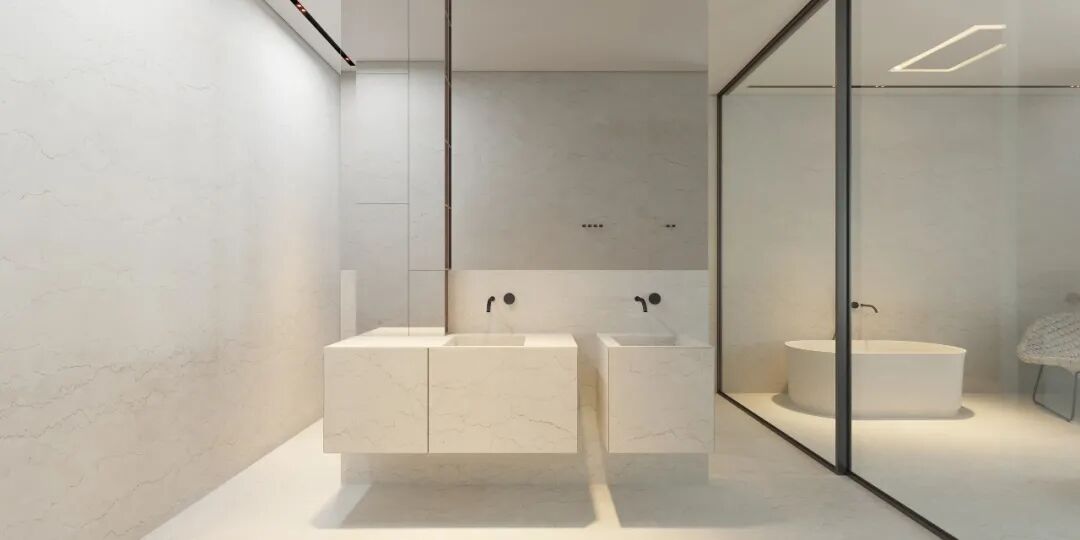 主卫空间灯光设计的非常棒,两个简约的洗手盆,不仅颜值高还兼具实用性,追求极简主义并不意味着拒绝设计的舒适性。
