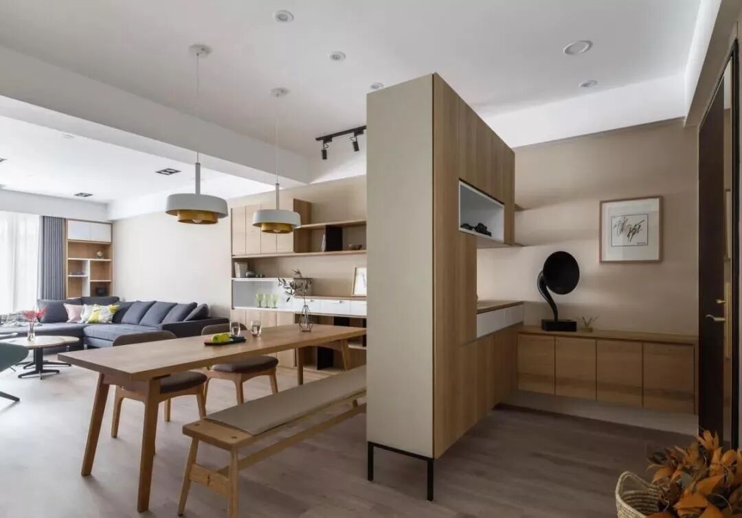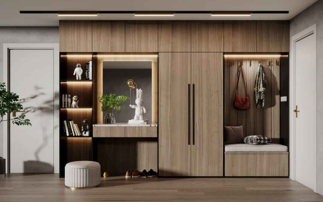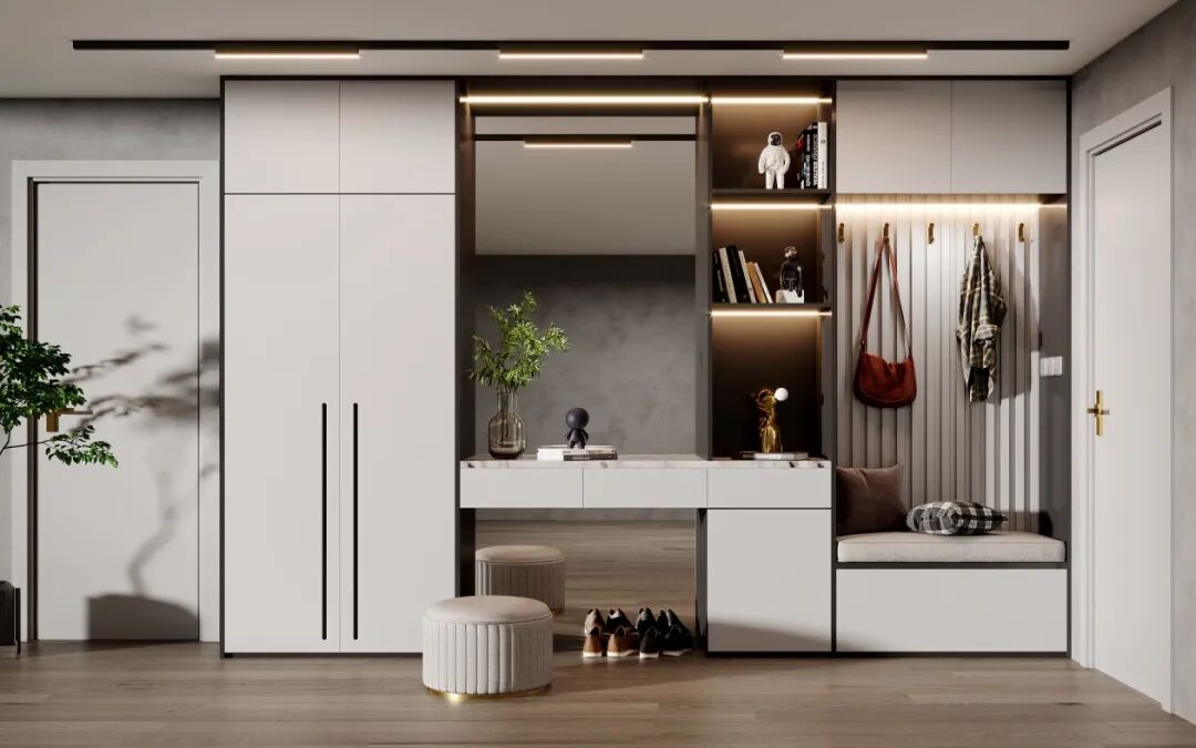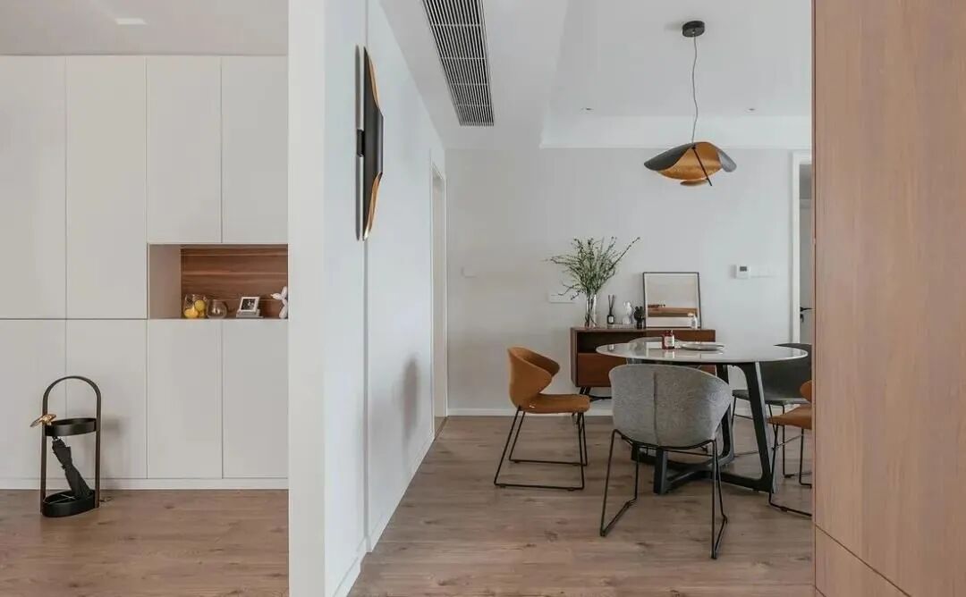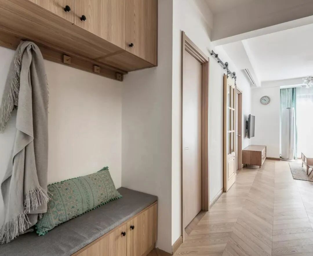 在玄关处打造衣帽间,铺上高端大气的木地板,可以让装出来的玄关漂亮又大气,再配上一盏合适的灯那效果就更美了。