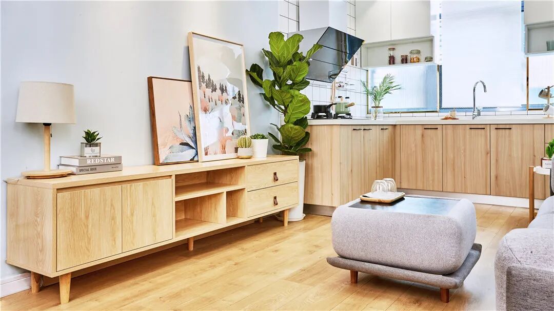 同色系的原木边柜和橱柜,搭配灰色系沙发,简洁明快,温暖又温情。