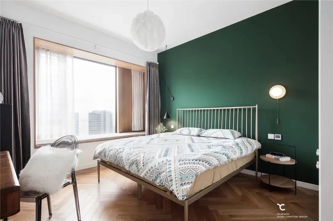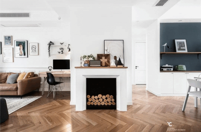 略深的原木色地板,为白的有些飘渺的北欧风增加了一丝厚重。近些年的北欧风格很多设计师都会使用鱼骨拼或者人字拼木地板,也让北欧风更加具有艺术感。