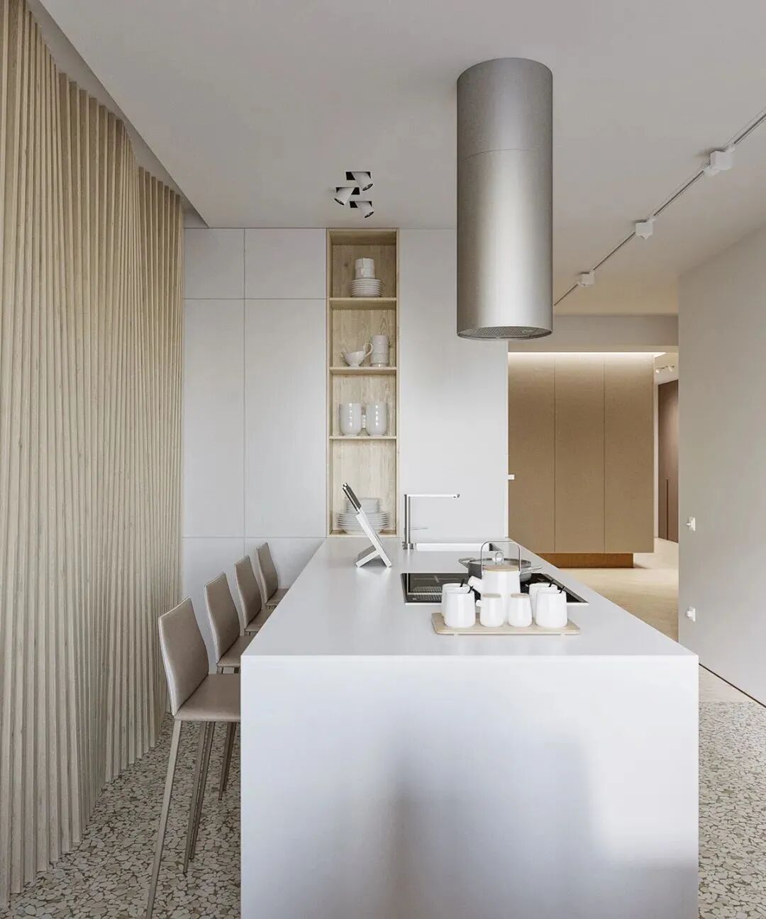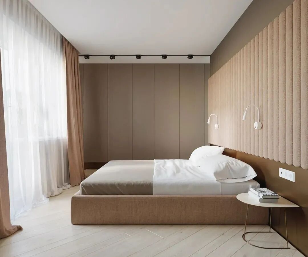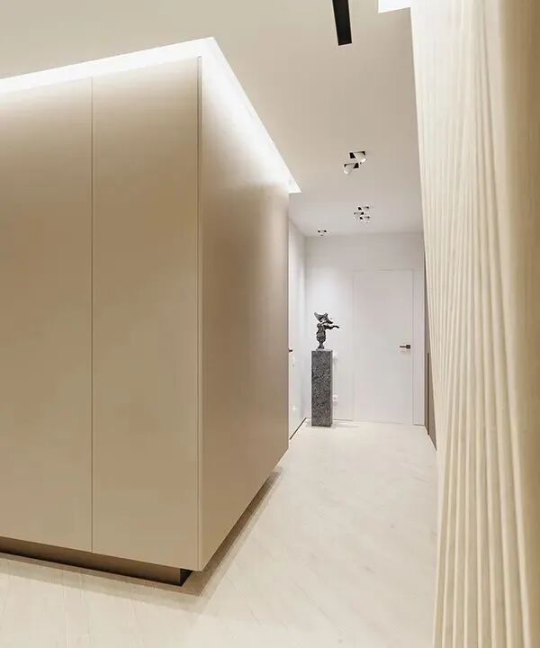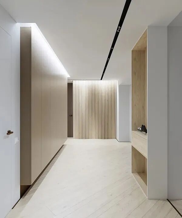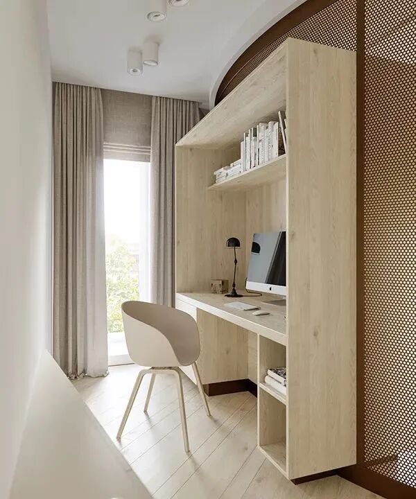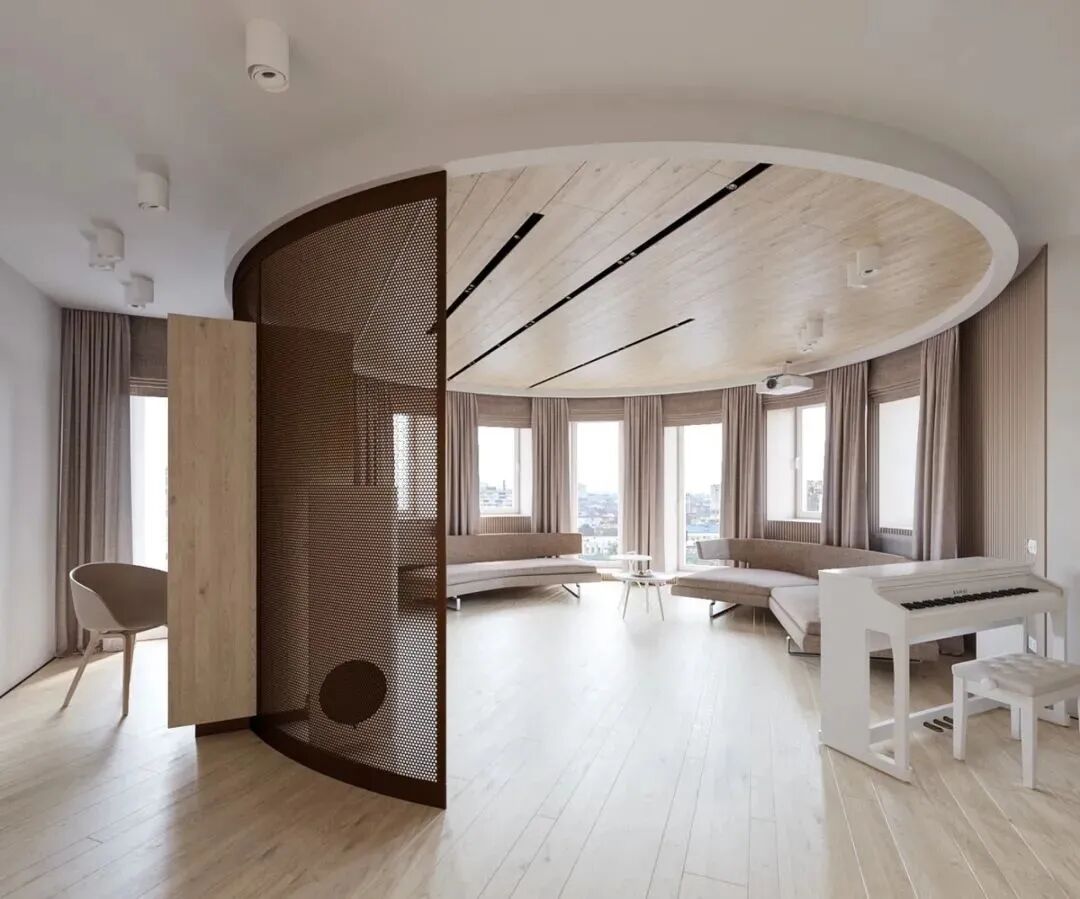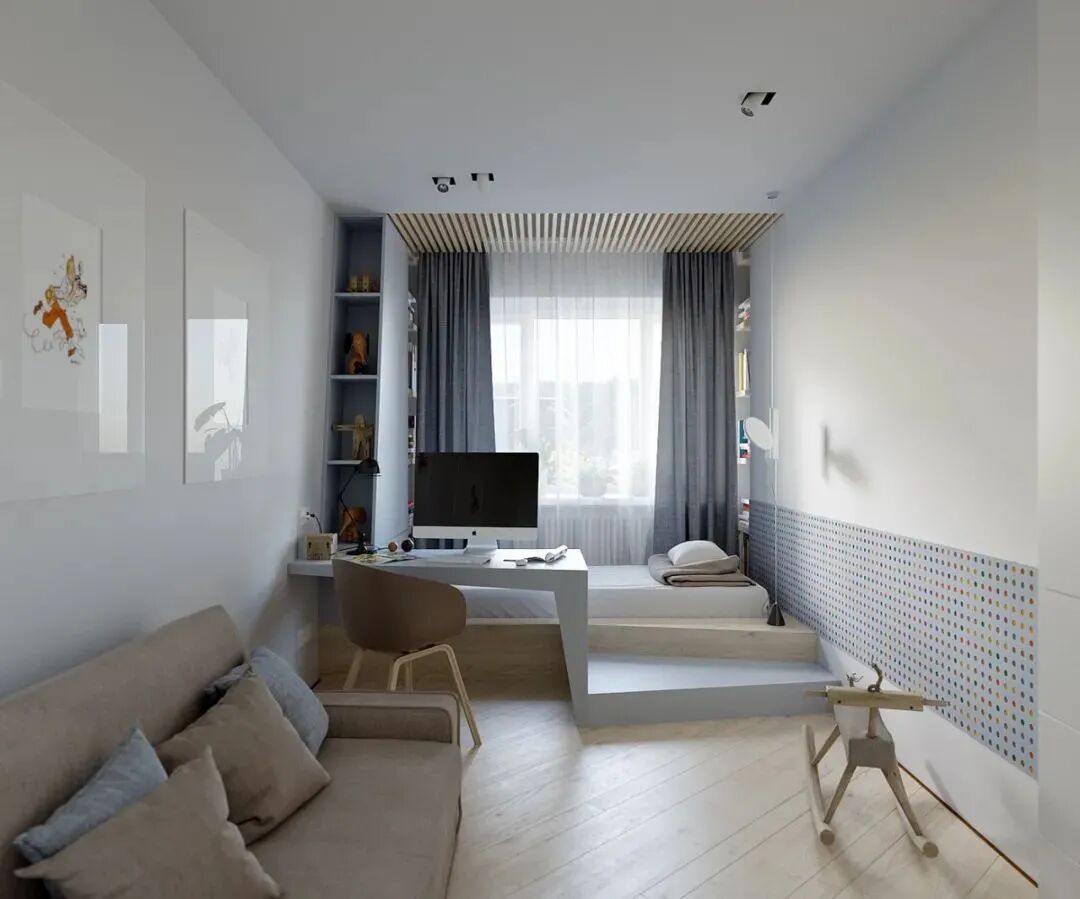 这是一套不怎么规则的公寓,大量的承重墙使得室内结构变得复杂,设计师以凸窗设计和白色、浅木色的大面积应用,扩大了空间感,尤其是木地板采用斜角铺设的方法,延伸了纵深感,感觉空间一下大了好多。