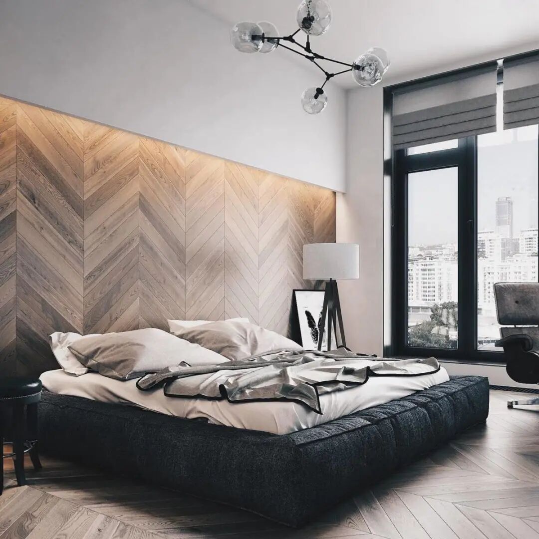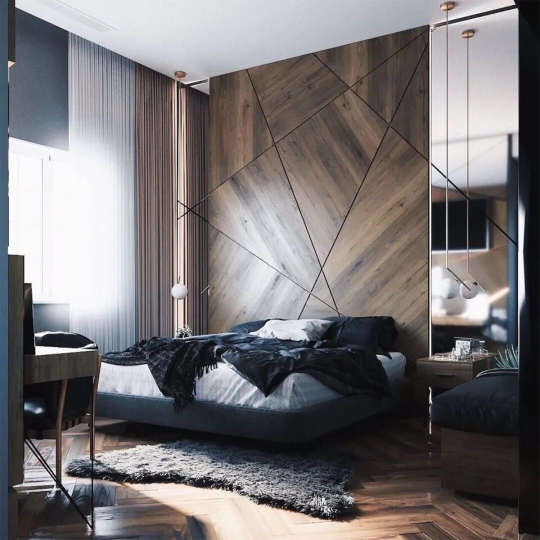 3▲用作卧室背景墙:不同的拼装纹理会有截然不同的气质。