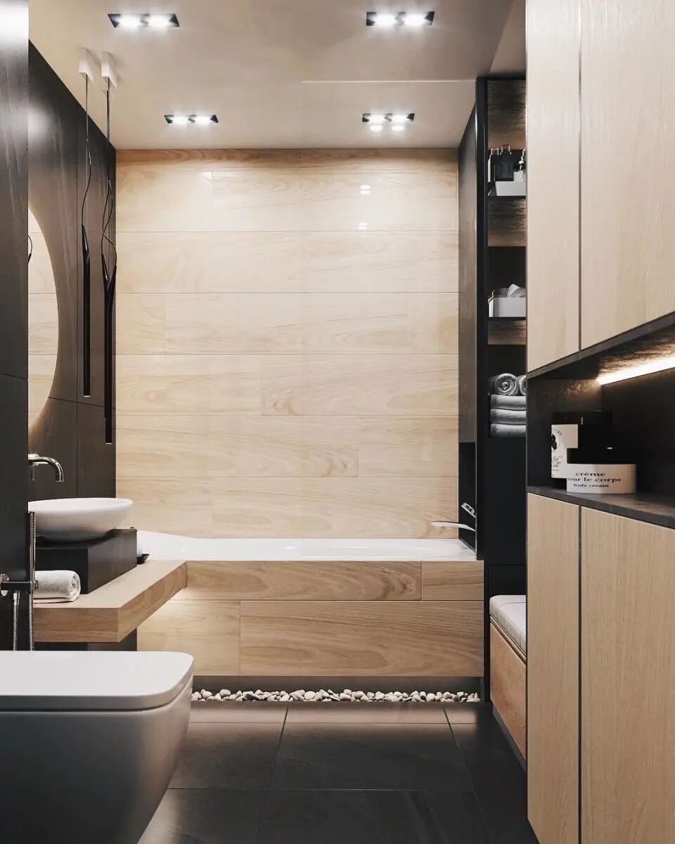 4▲用在卫浴间:木地板上墙,湿冷的卫浴间都显的温暖了不少。当然也有人担心木地板遇水会变形的问题,其实不用担忧,一是目前很多家庭都已经是干湿分离的卫生间;二是一些材质非常好的木地板是不惧水的哦!