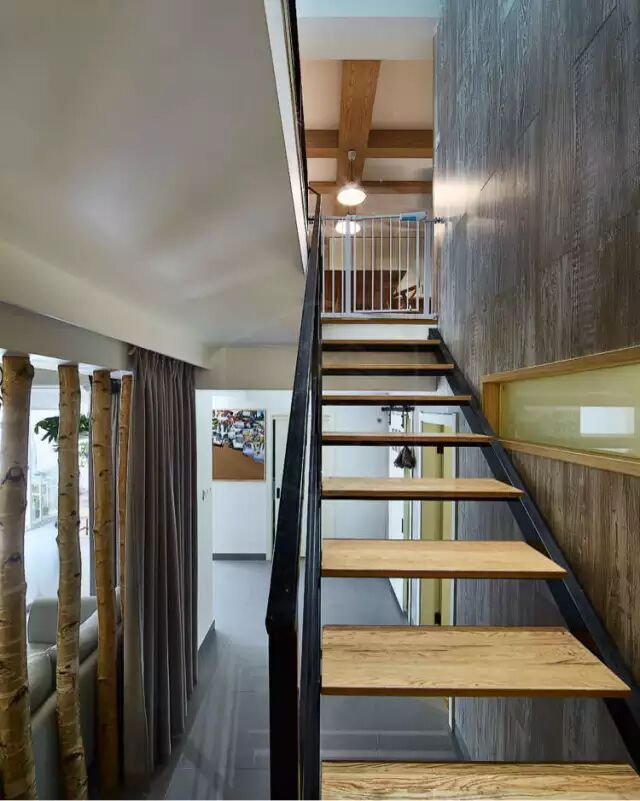 6▲楼梯内侧墙面也用地板上墙,似乎行进在一段行走的时光。