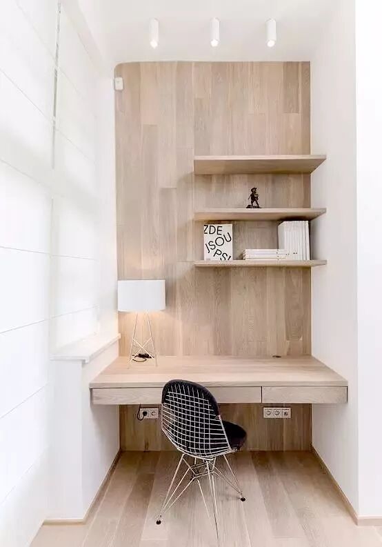 8▲地面同墙地板上墙,连书柜也是同款风格,建议采用浅色系地板,大面积的深色系容易有压抑逼仄之感 。