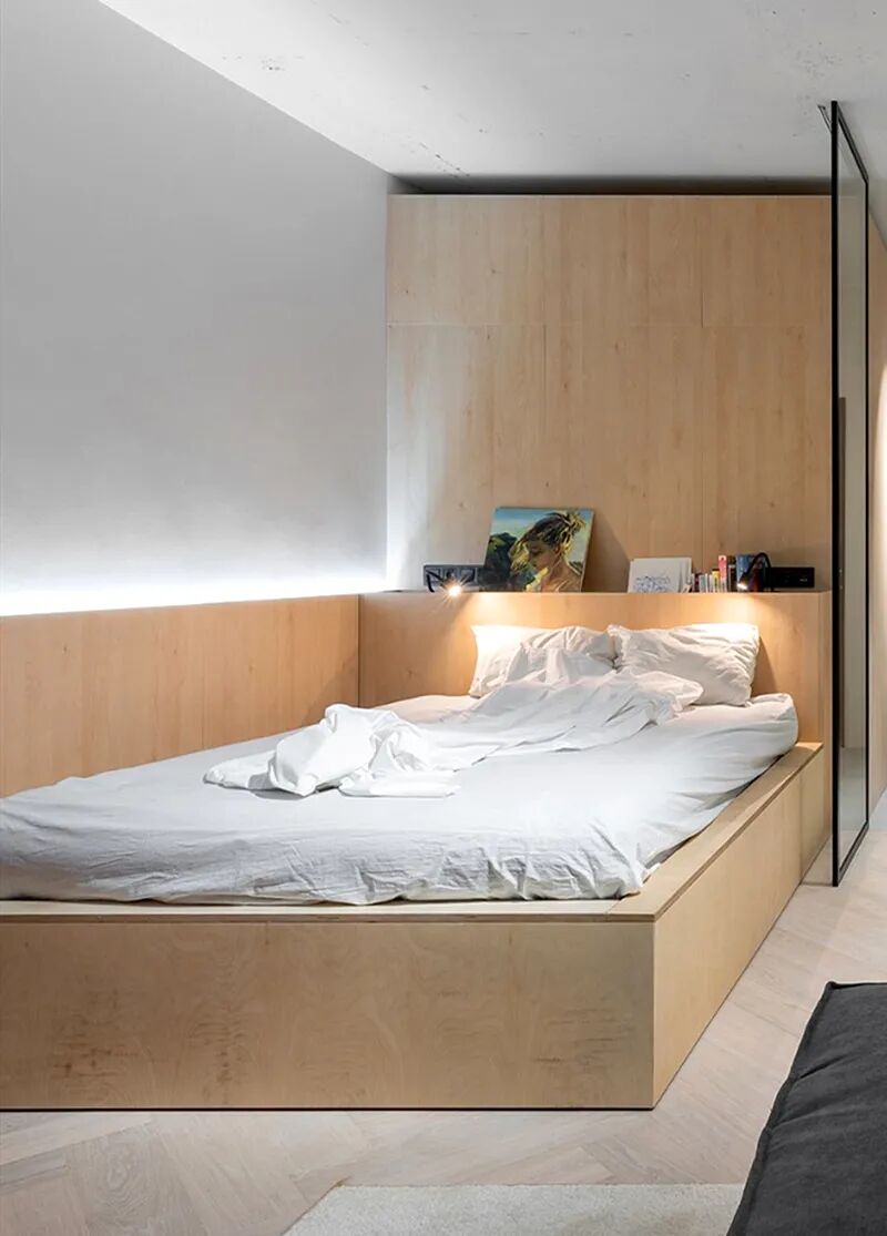在小面积的开放式空间内,略高于水平线的地台床,搭配立体感十足的人字拼木地板,通透却也显轻松格调。