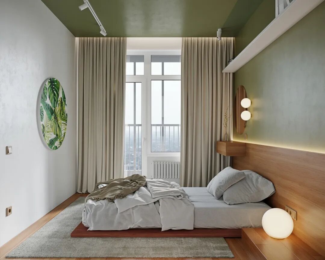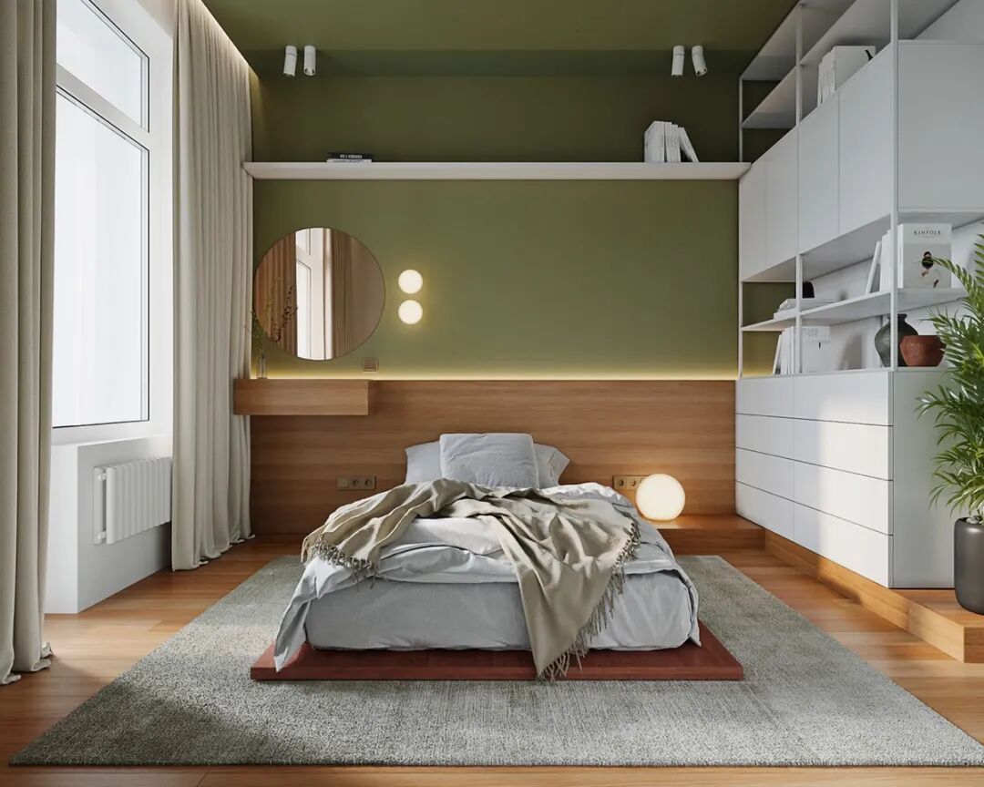 抹茶绿,一种沁入人心的色彩,与无处不在的木色融合,让卧室好似沉浸在氧气森林中,酣然入睡。