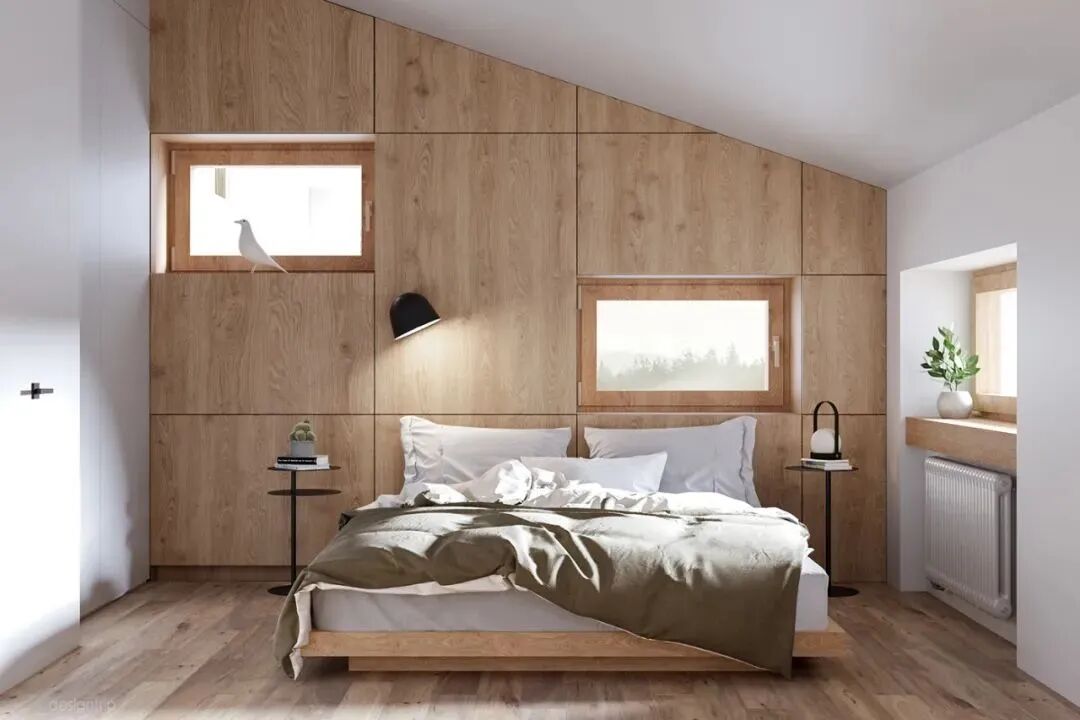 纯粹素雅的木色,由地面延伸至床面,在微微起伏中氤氲出满室的温暖与舒适,自然雅致。