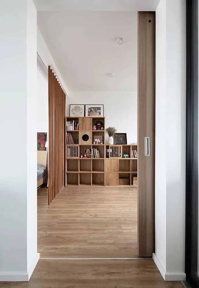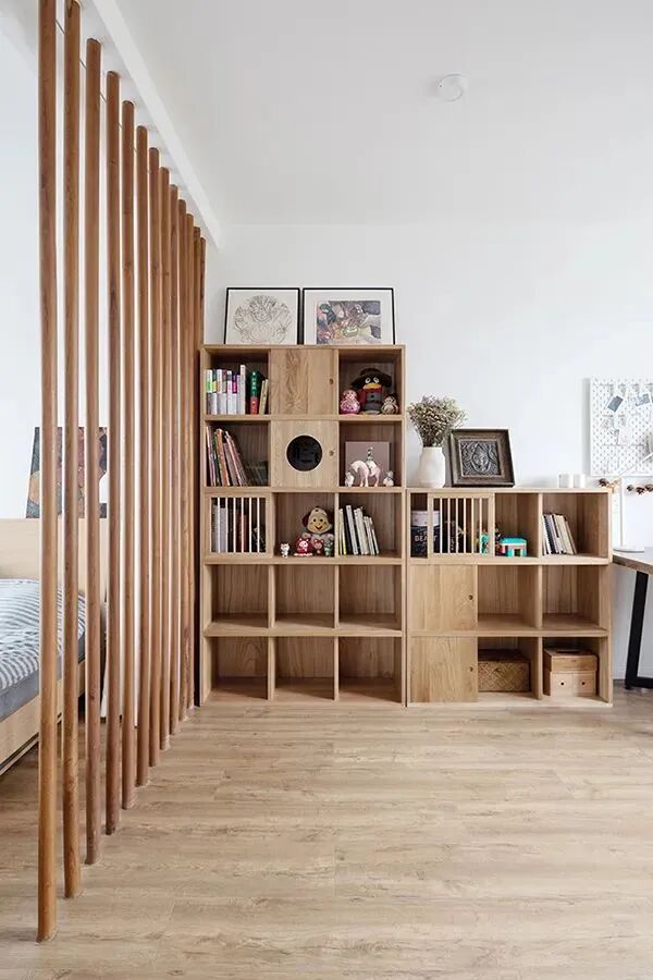 ▲木栏栅的另一端,是一个定制的书架,高矮相叠的书架,开放+封闭的格架设计,布置上书籍与小饰品,还有花瓶与装饰画,使得空间更加文艺优雅。