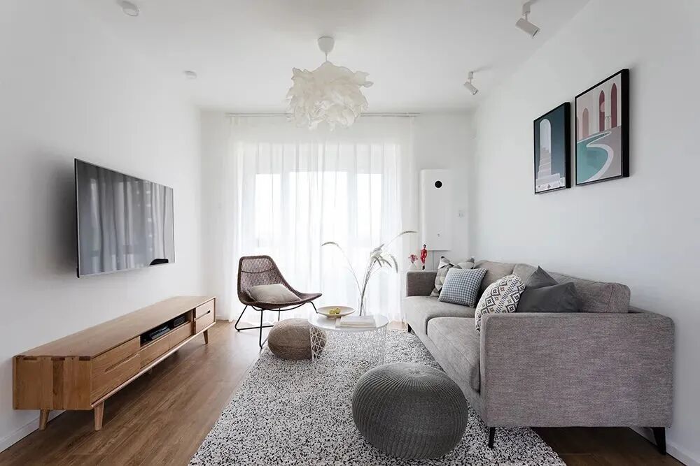 ▲客厅空间总体简约舒适的空间氛围,电视墙是大白墙+壁挂电视机,布置木质的电视柜,还有灰色的布艺沙发与地毯,整个空间充满自然轻松的惬意感。